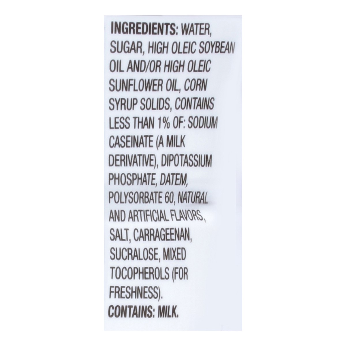 Water, Sugar, High Oleic Soybean Oil, Corn Syrup Solids, Less Than 2% Of: Sodium Caseinate (a Milk Derivative)*, Dipotassium Phosphate, Datem, Polysorbate 60, Natural And Artificial Flavors, Salt, Car…