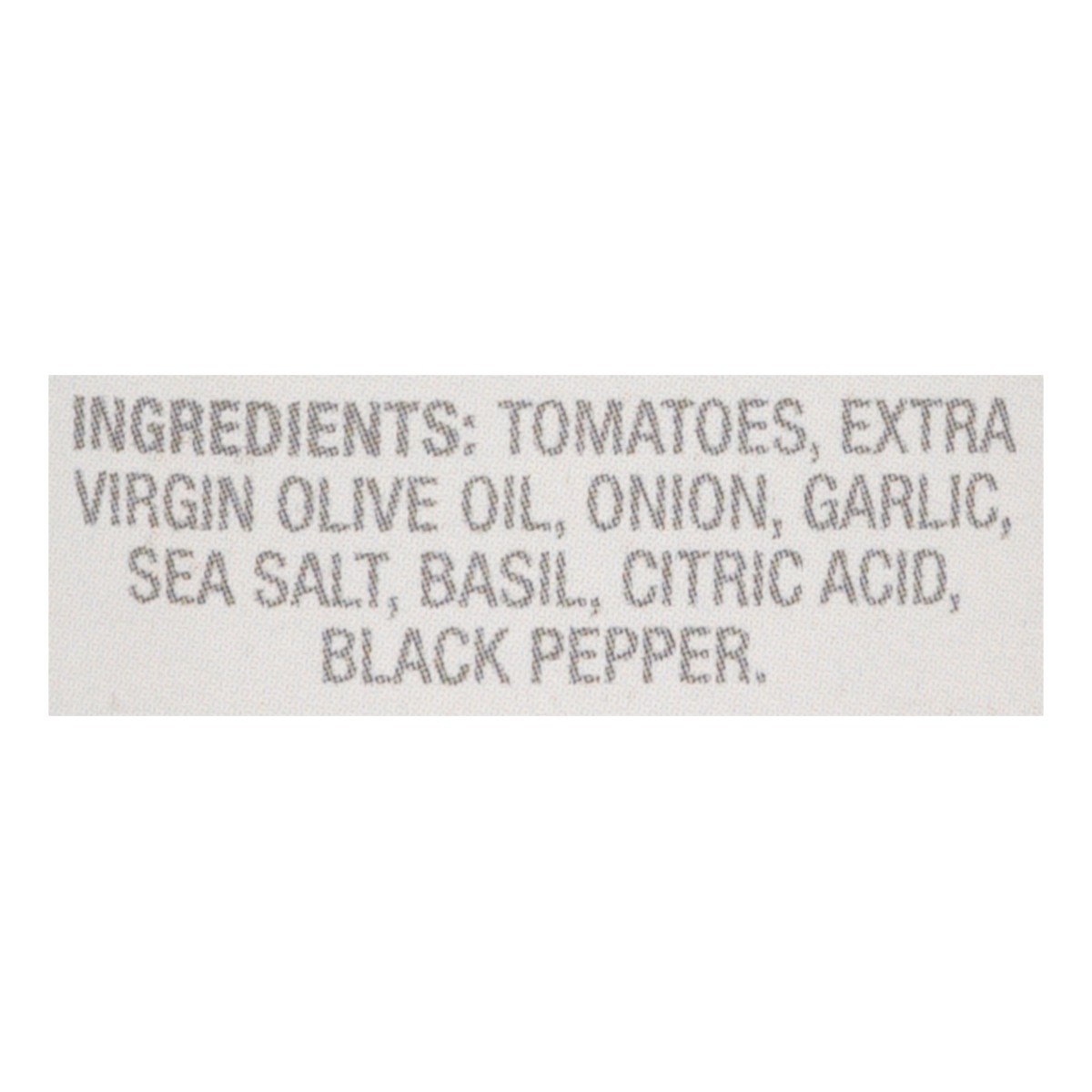 Tomatoes, Extra Virgin Olive Oil, Onion, Garlic, Sea Salt, Basil, Citric Acid, Black Pepper.