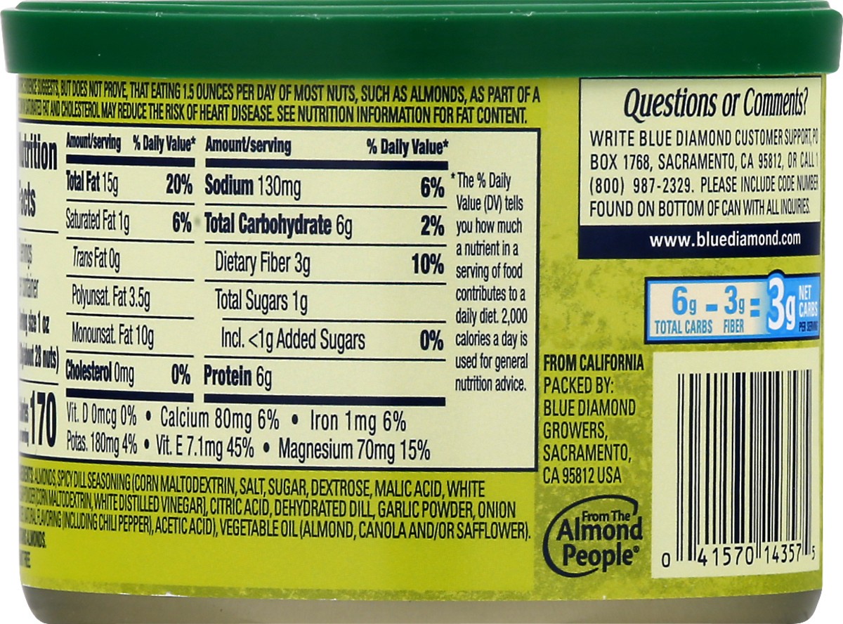 Almonds, Spicy Dill Seasoning (Corn Maltodextrin, Salt, Sugar, Dextrose, Malic Acid, White Vinegar Powder [Corn Maltodextrin, White Distilled Vinegar], Citric Acid, Dehydrated Dill, Garlic Powder, Oni…