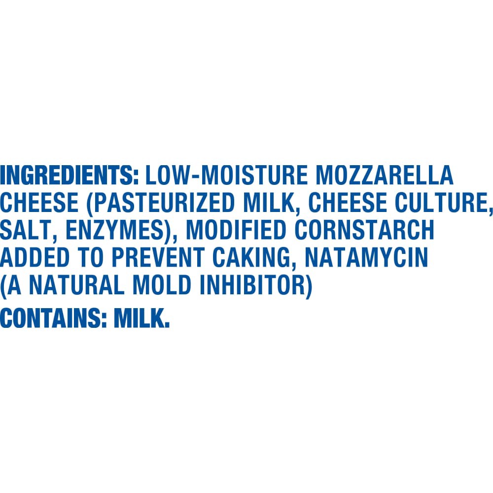 LOW-MOISTURE MOZZARELLA CHEESE (PASTEURIZED MILK, CHEESE CULTURE, SALT, ENZYMES), MODIFIED CORNSTARCH ADDED TO PREVENT CAKING, NATAMYCIN (A NATURAL MOLD INHIBITOR)