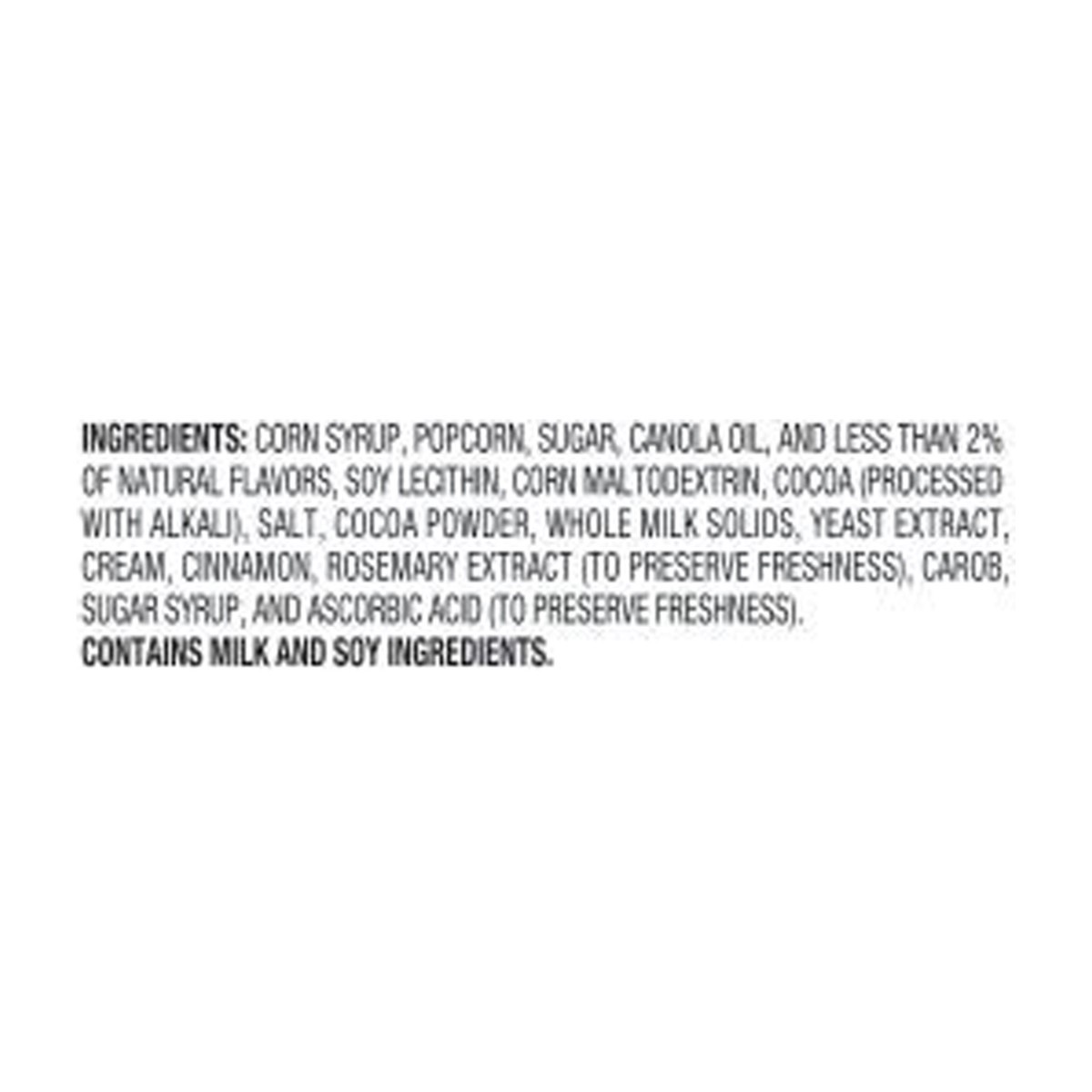 Corn Syrup, Popcorn, Sugar Canola Oil, and Less than 2% of Natural Flavors, Soy Lecithin, Corn Maltodextrin, Cocoa (Processed with Alkali), Salt, Cocoa Powder, Whole Milk Solids, Yeast Extract, Cream,…