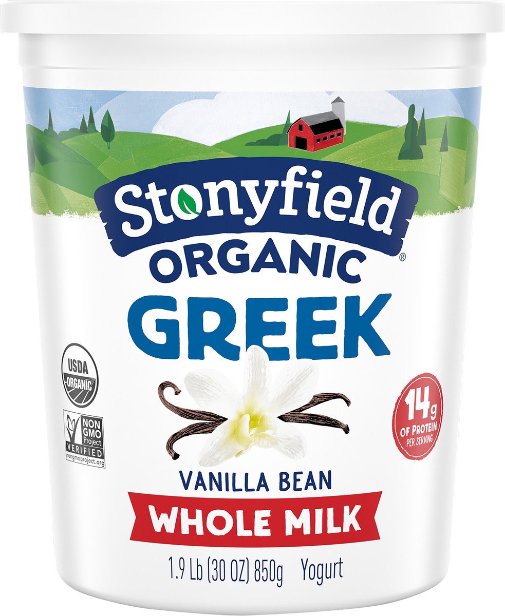 - STONYFIELD ORGANIC Vanilla Bean Greek Whole Milk Yogurt is the perfect breakfast staple or afternoon snack for you and your little ones alike. Pair with fresh fruit or granola or enjoy as is.
