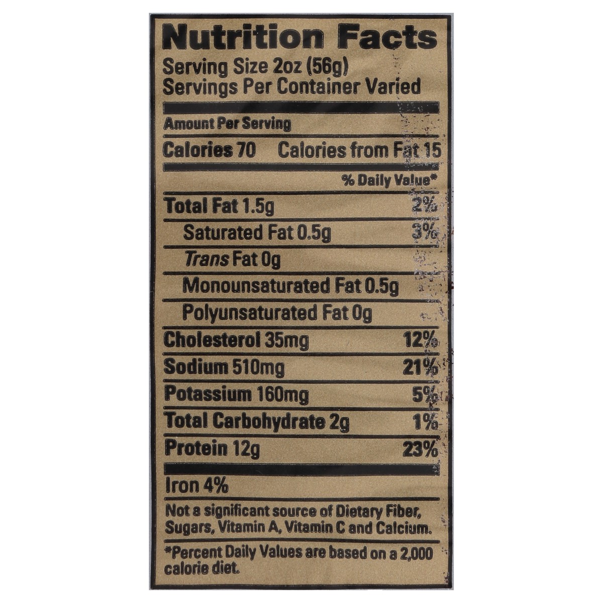 0 g trans fat per serving. Gluten free. Low fat. Milk free. Extra lean. Low in saturated fat. No soy. Rich in protein. No MSG. No preservatives. Inspected for wholesomeness by US Department of Agricul…