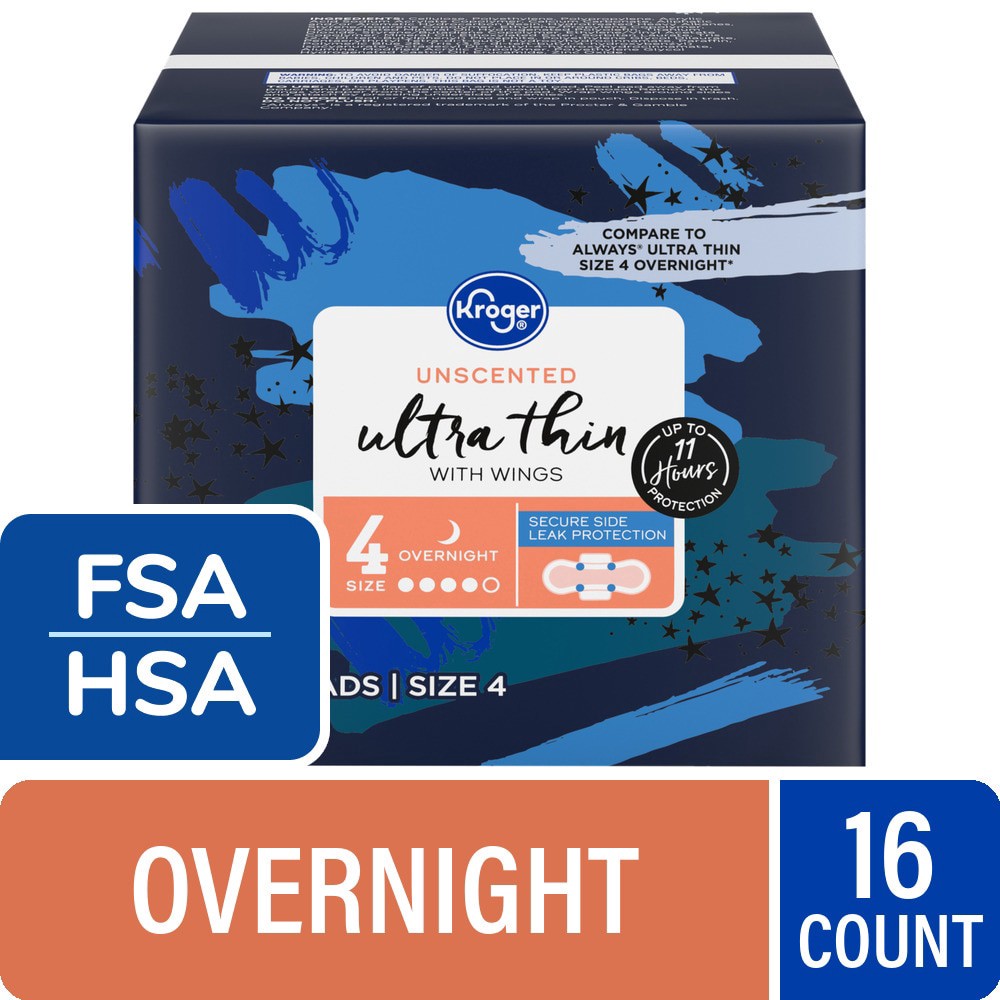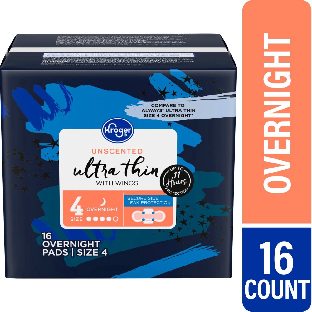 Kroger® Ultra Thin Pads with Wings Overnight Size 4 Unscented are excellent for comfort and feature leak secure® protection. Experience up to 11 hours of protection against leaks, thanks to these over…