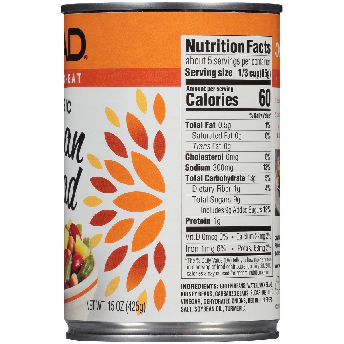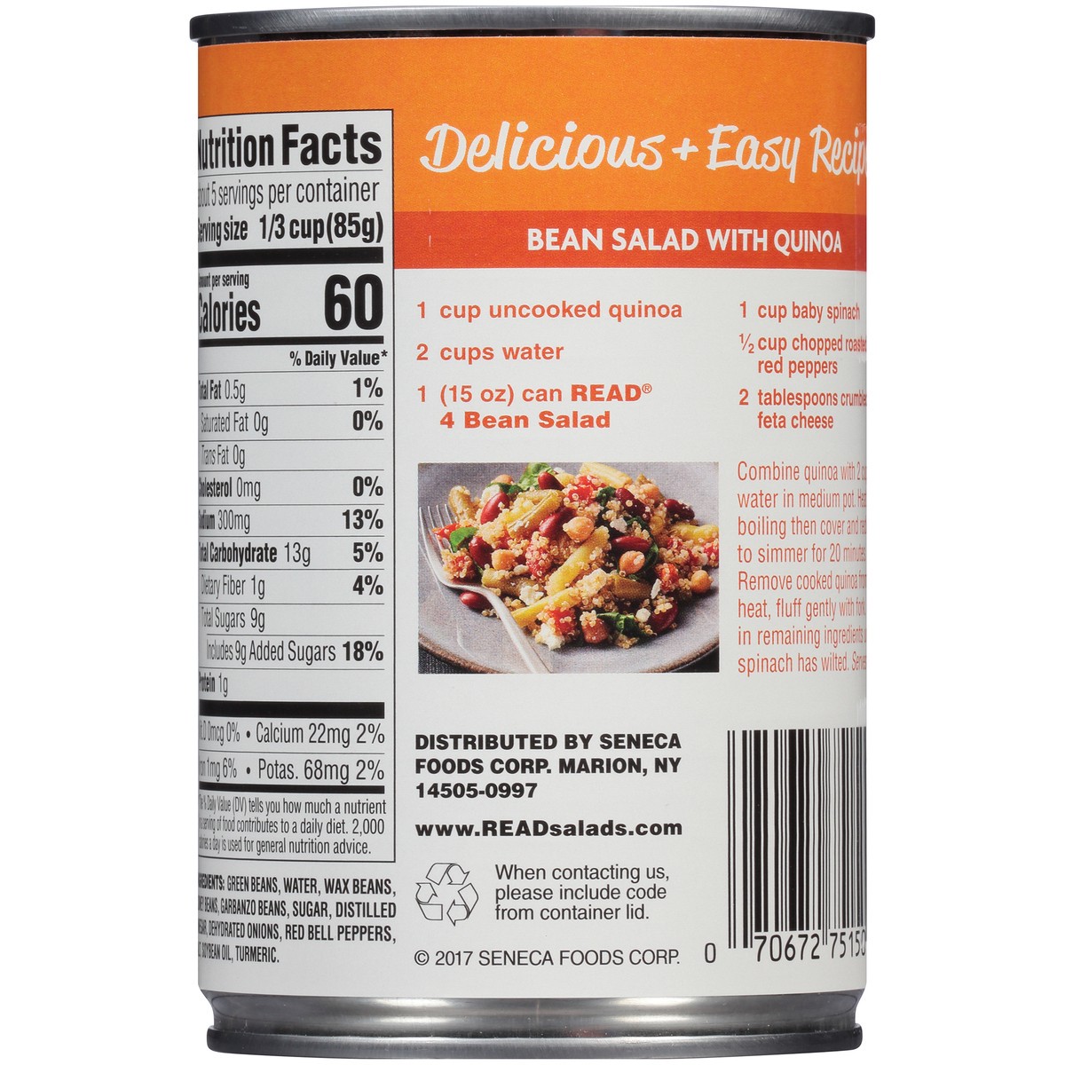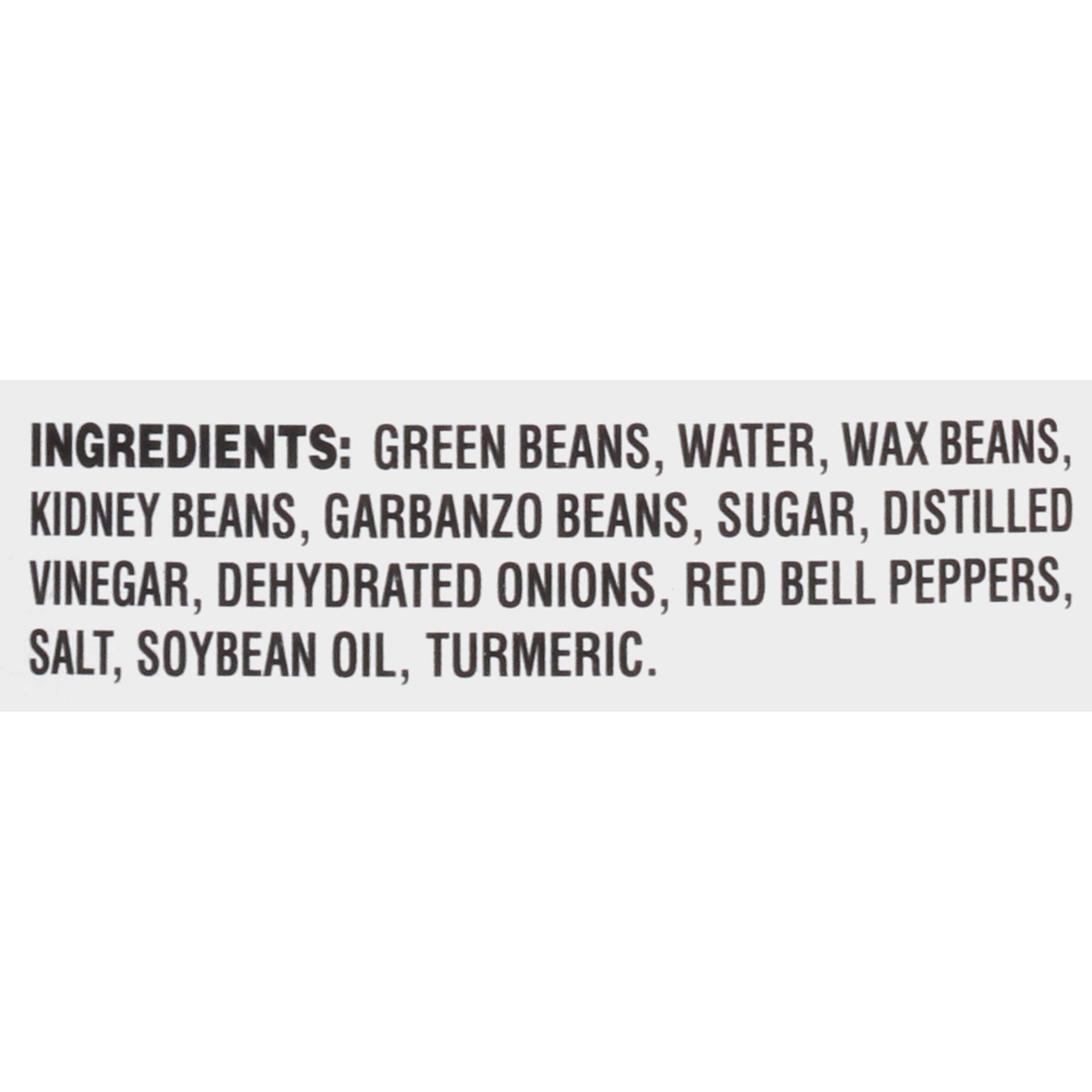 Green Beans, Water, Wax Beans, Kidney Beans, Garbanzo Beans, Sugar, Distilled Vinegar, Dehydrated Onions, Red Bell Peppers, Salt, Soybean Oil, Turmeric.