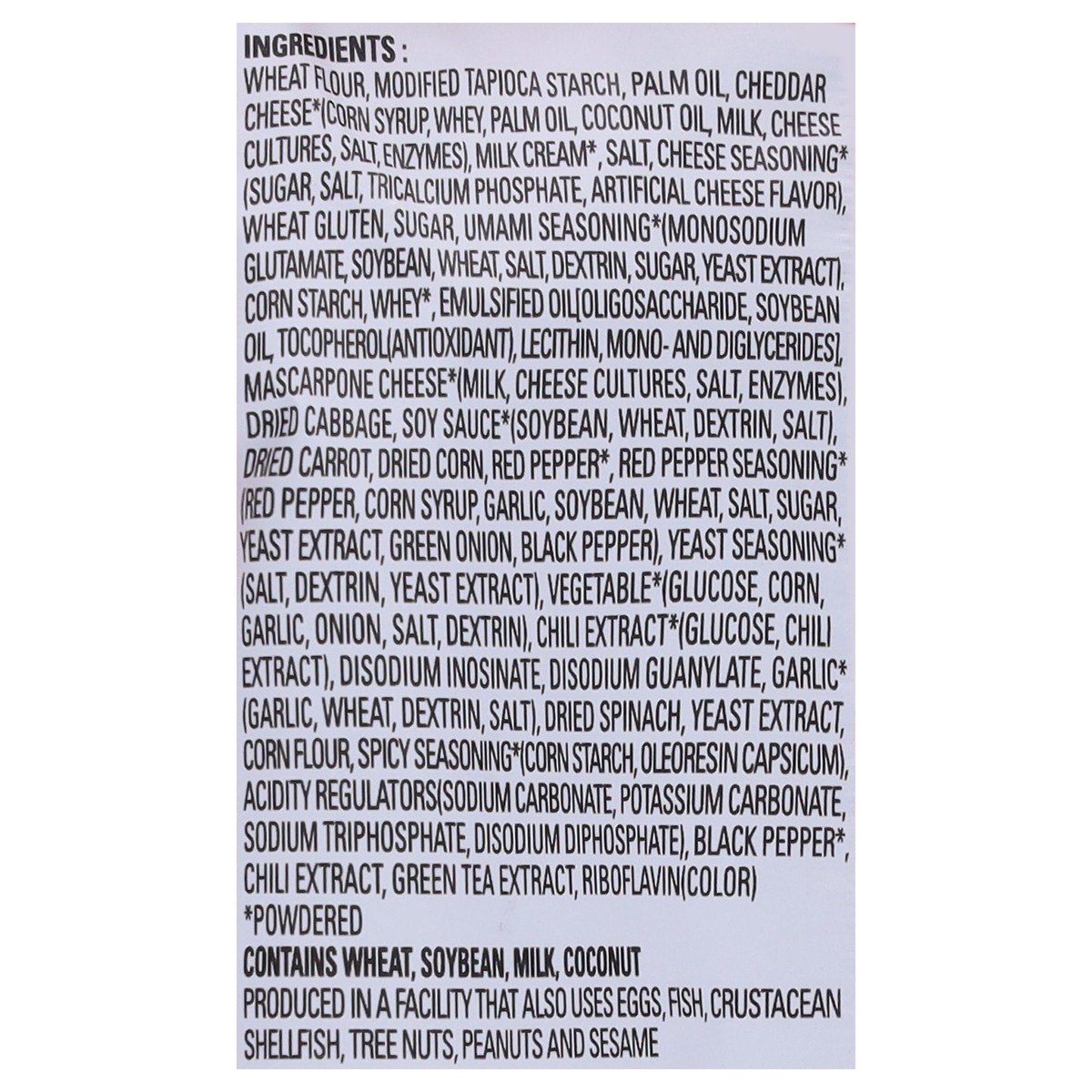 Wheat Flour, Modified Tapioca Starch, Palm Oil, Cheddar Cheese* (Corn Syrup, Whey, Palm Oil, Coconut Oil, Milk, Cheese Cultures, Salt, Enzymes), Milk Cream*, Salt, Cheese Seasoning* (Sugar, Salt, Tric…
