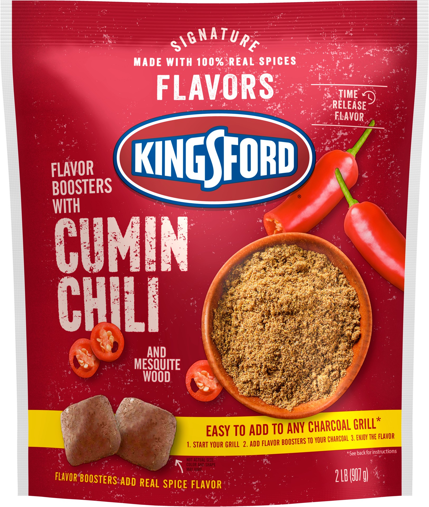 Cumin and chili come together for unique, one-of-a-kind taste. Get bold, smoky flavor you can see, smell and taste with Kingsford Flavor Boosters. The steady release of cumin and chili flavors make fo…