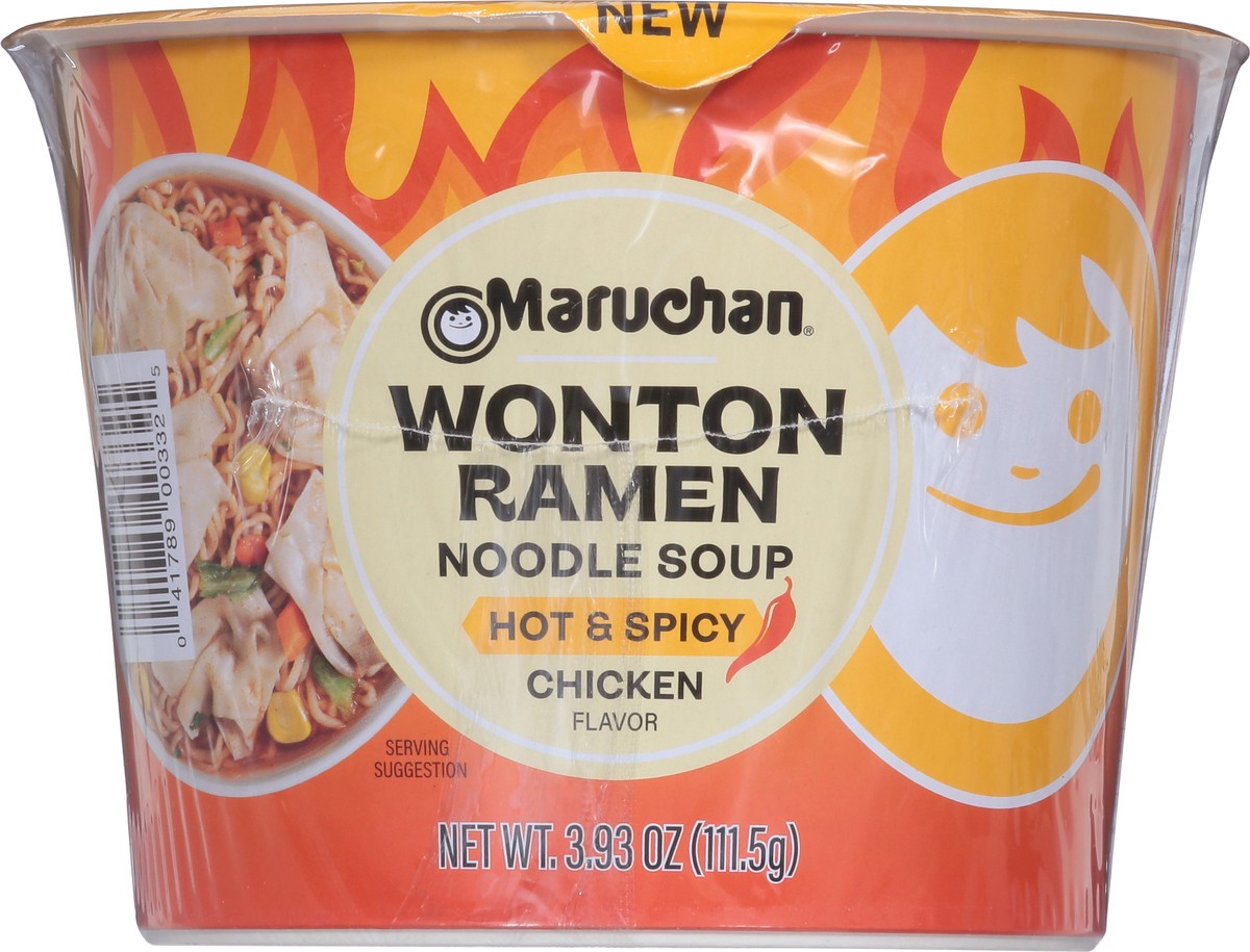 Hot & Spicy Chicken Flavor Maruchan Wonton Ramen Soup comes in a good size bowl and is easy to make. Large portions of ramen noodles and plump wontons in a rich spicy soup broth create an extremely sa…
