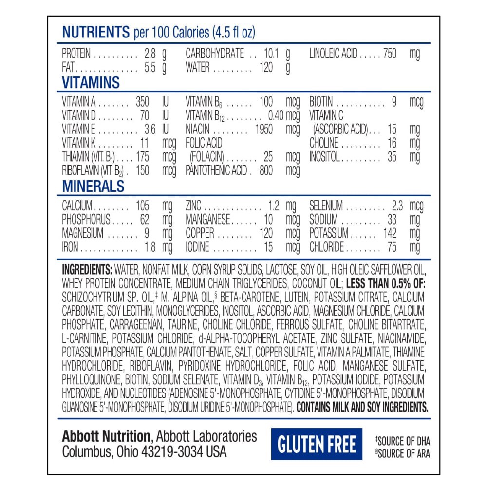 Water, Nonfat Milk, Corn Syrup Solids, Lactose, Soy Oil, High Oleic Safflower Oil, Whey Protein Concentrate, Medium Chain Triglycerides, Coconut Oil; Less than 0.5% of: Schizochytrium SP., Oil (Source…