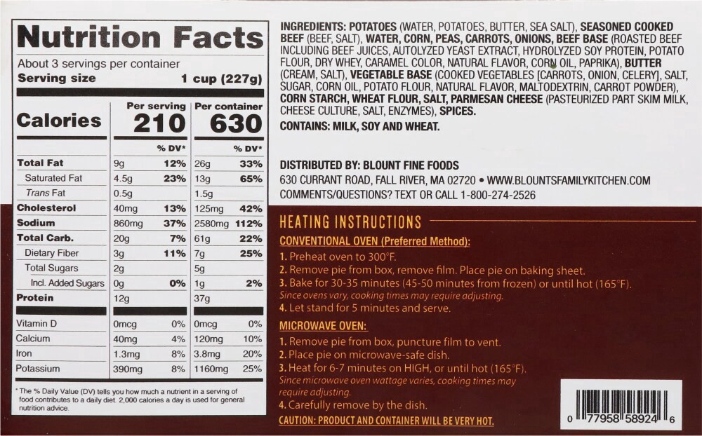 Potatoes (Water, Potatoes, Butter, Sea Salt), Seasoned Cooked Beef (Beef, Salt), Water, Corn, Peas, Carrots, Onions, Beef Base (Roasted Beef Including Beef Juices, Autolyzed Yeast Extract, Hydrolyzed …