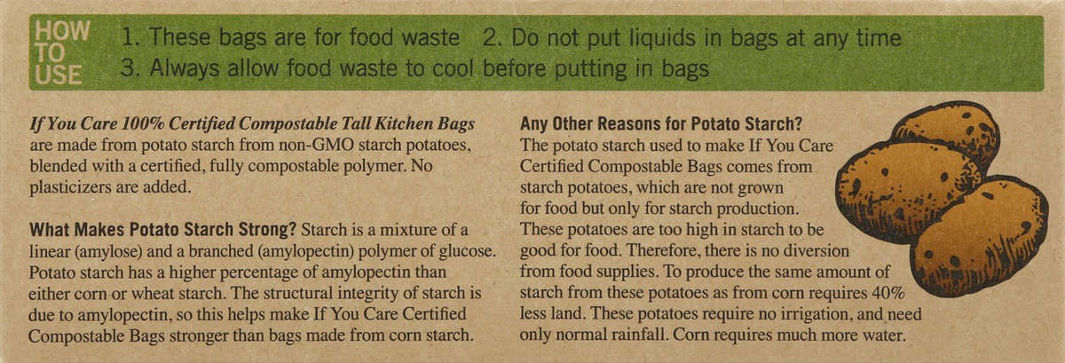 How to Use: 1. These bags are for food waste. 2. Do not put liquids in bags at any time. 3. Always allow food waste to cool before putting in bags. Store bags in cool, dry place away from direct sunli…
