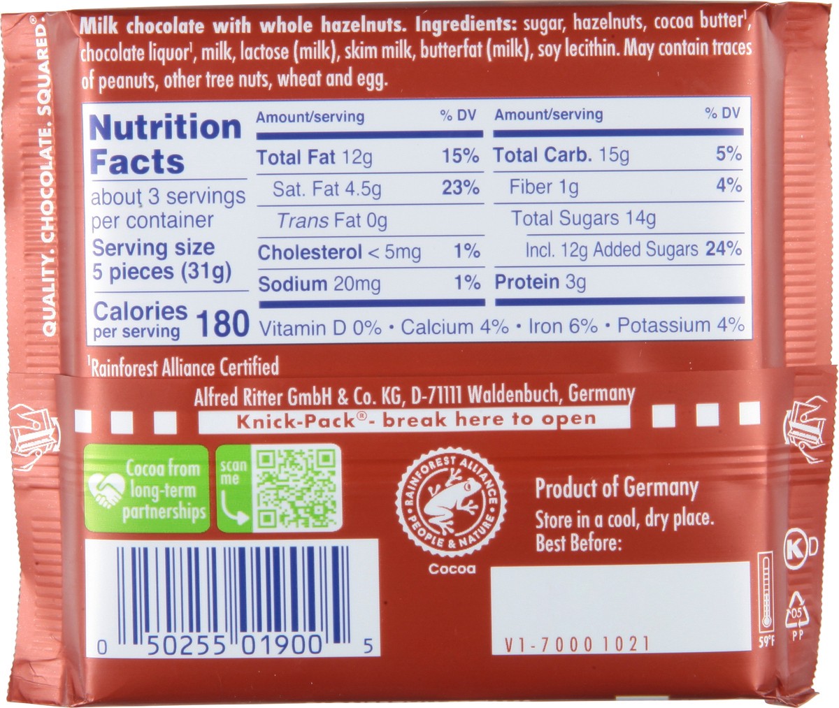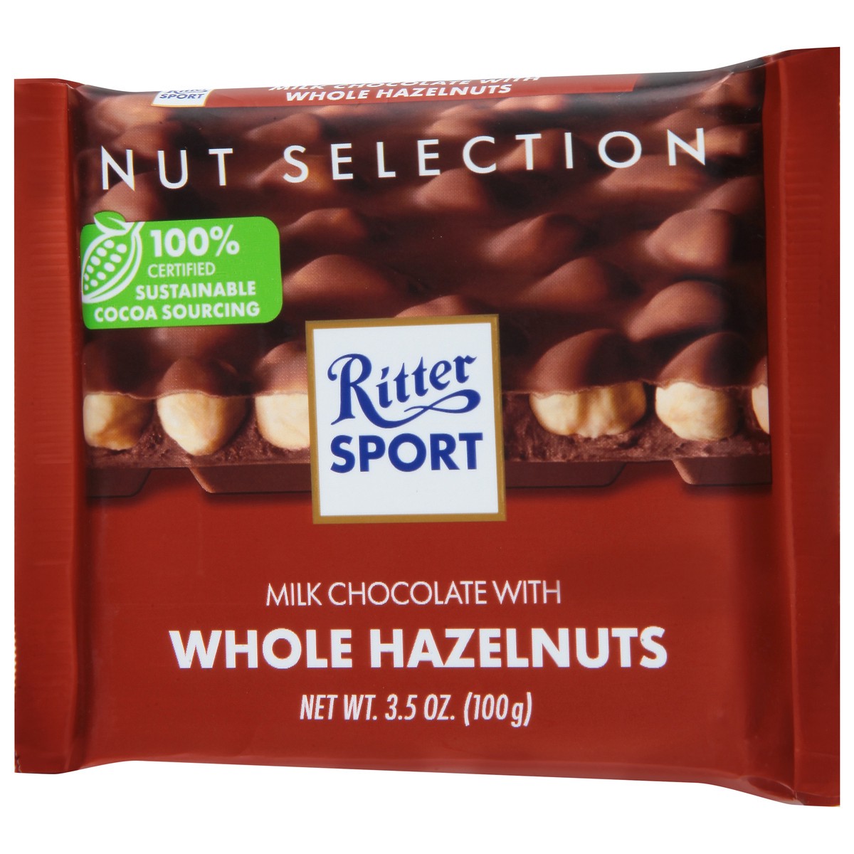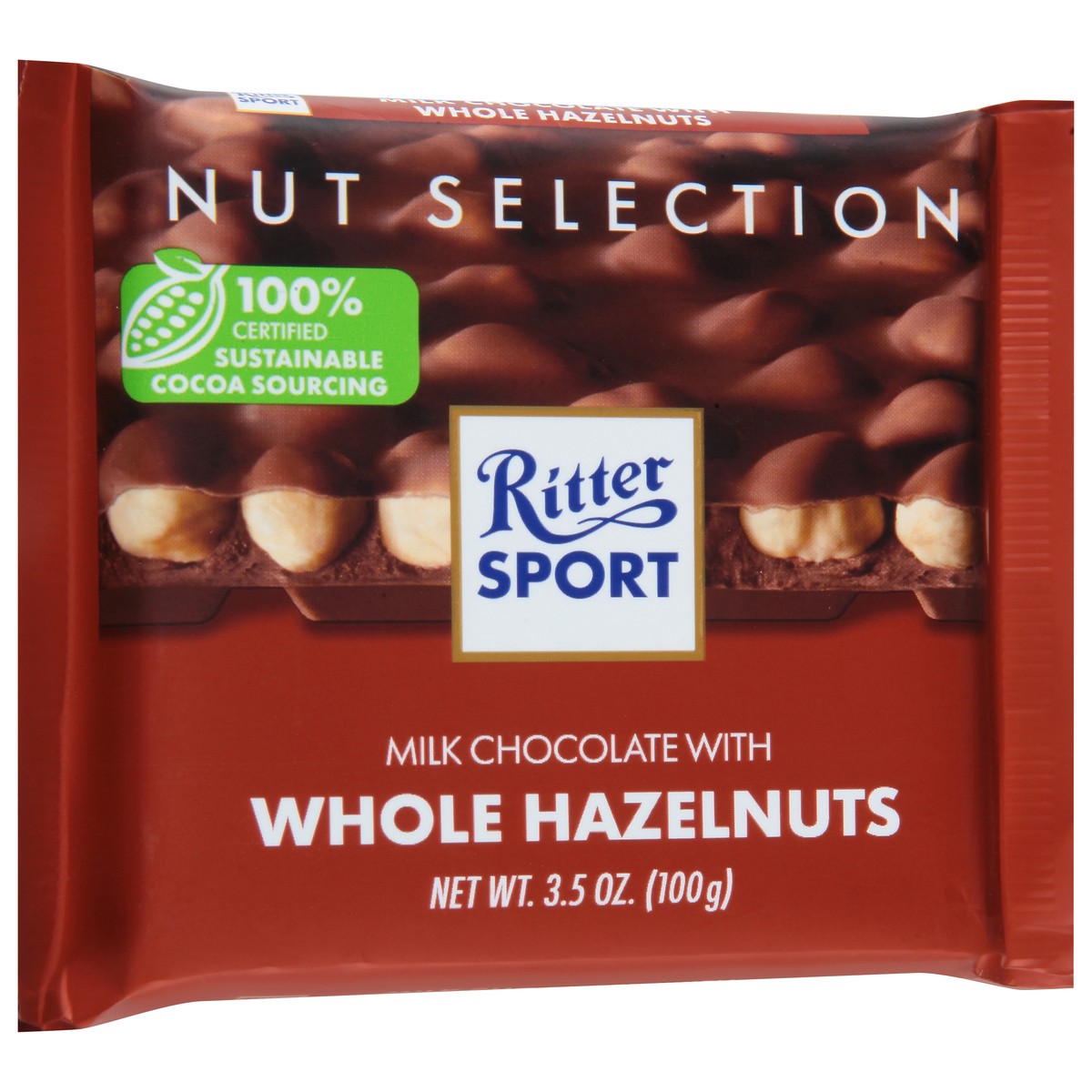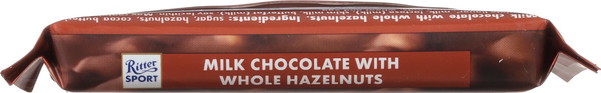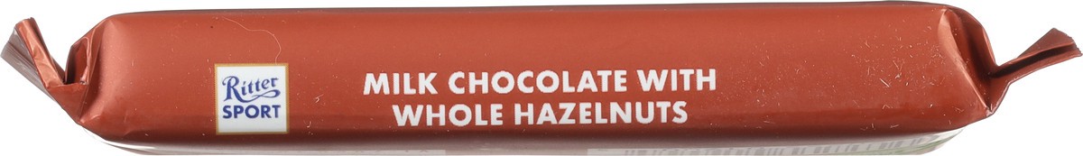 Ritter Sport Milk Chocolate (30% Cocoa) with Whole Hazelnuts. FOR BITERS. NOT FOR SUCKERS. Whole crunchy roasted hazelnuts from Turkey, chosen specifically for their 11-13 millimeter diameter, are ful…