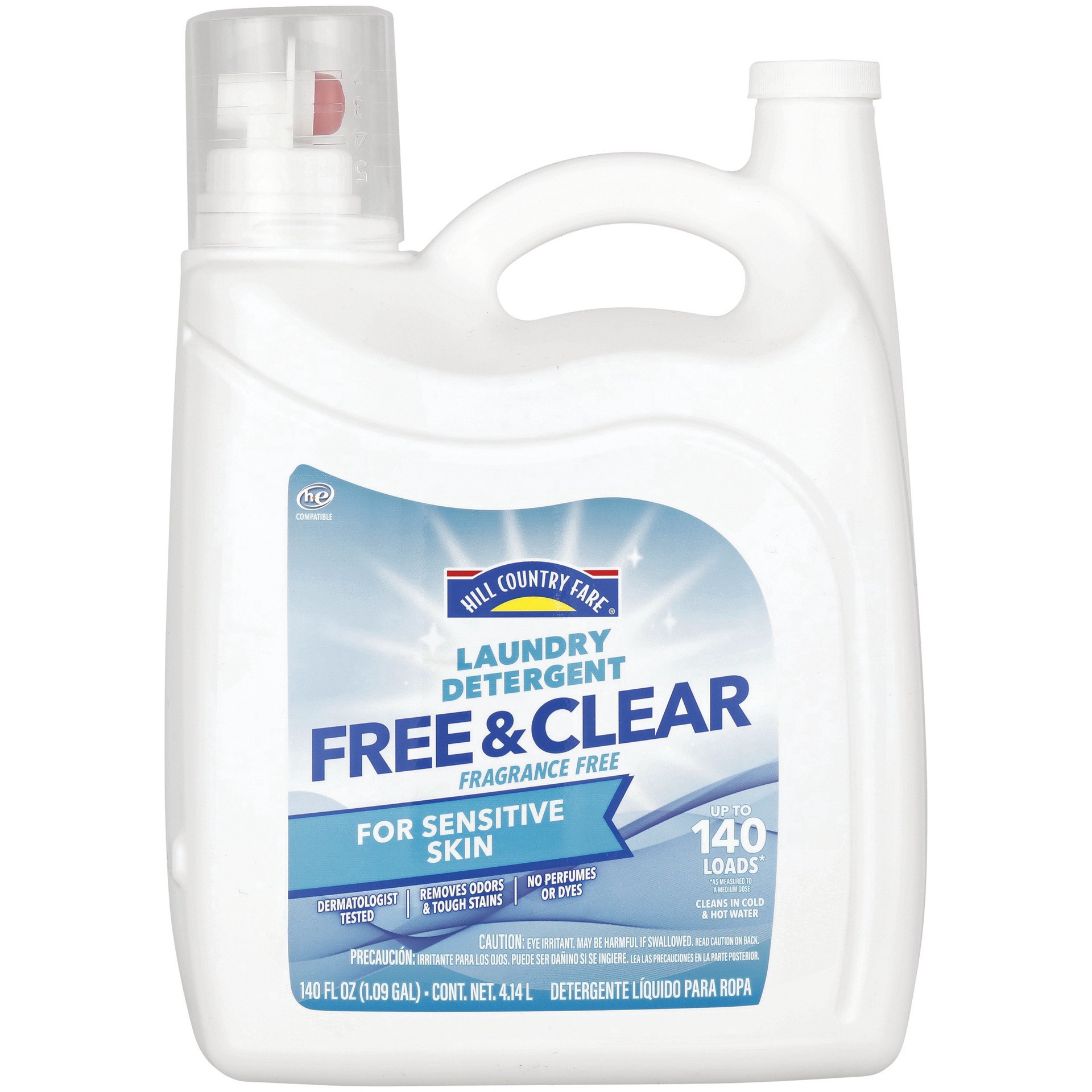 Go easy on sensitive skin by using Hill Country Fare Free & Clear liquid laundry detergent. Free of fragrances, perfumes and dyes, it's a dermatologist-tested soap for your well-loved linens and cloth…