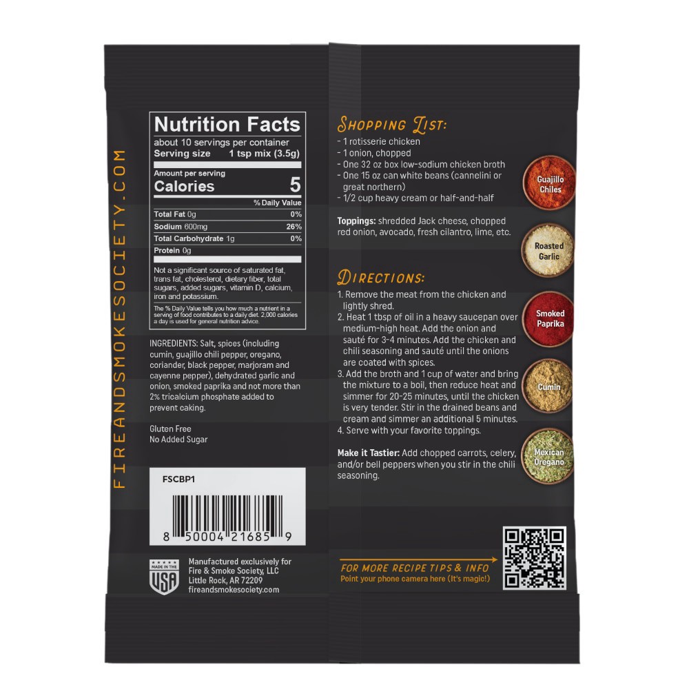 Gluten free. No added sugar. Make with 1 rotisserie chicken. Spices & sauces. fireandsmokesociety.com. For more recipe tips & info point your phone camera here (it's magic!). Made in the USA.