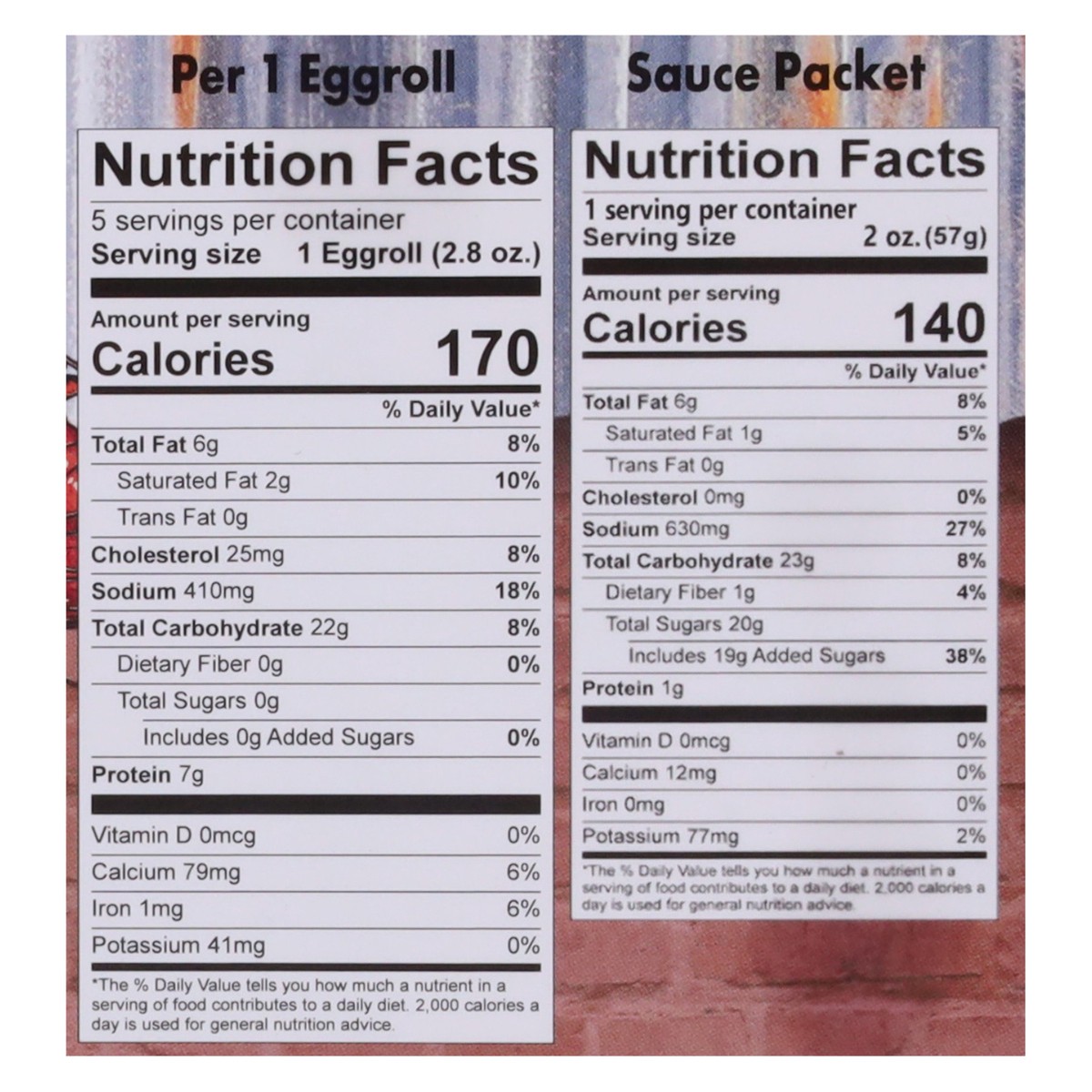 Eggrolls: contains: shellfish, milk, wheat, yellow 5, msg.,sauce: contains: soy, wheat, milk.