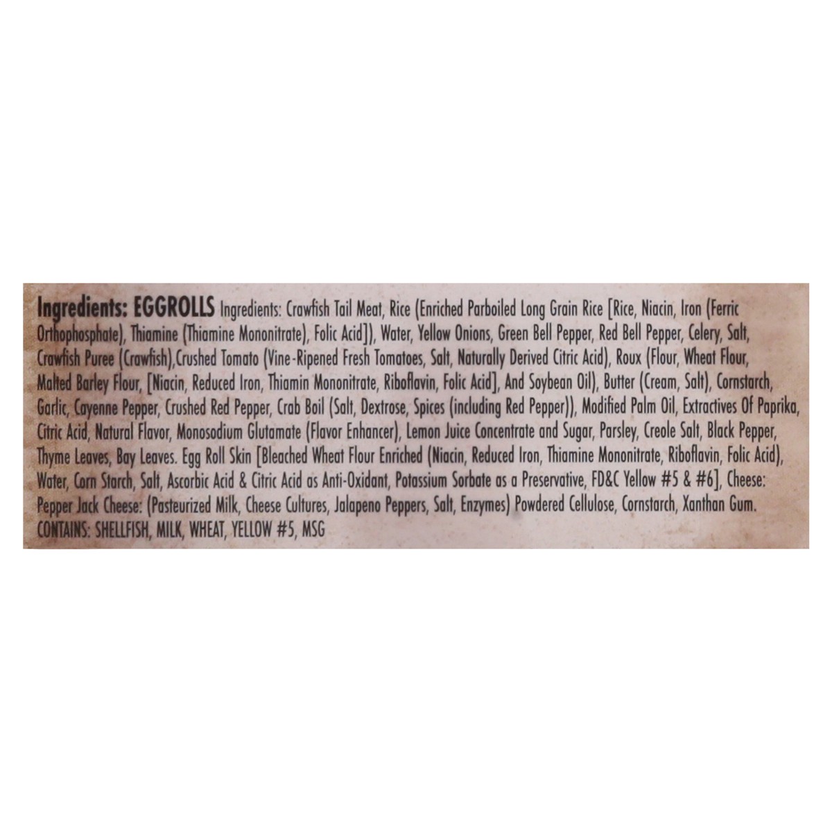 Eggrolls: Crawfish Tail Meat, Rice (Enriched Parboiled Long Grain Rice [Rice, Niacin, Iron (Ferric Orthophosphate), Thiamine (Thiamine Mononitrate), Folic Acid)], Water, Yellow Onions, Green Bell Pepp…
