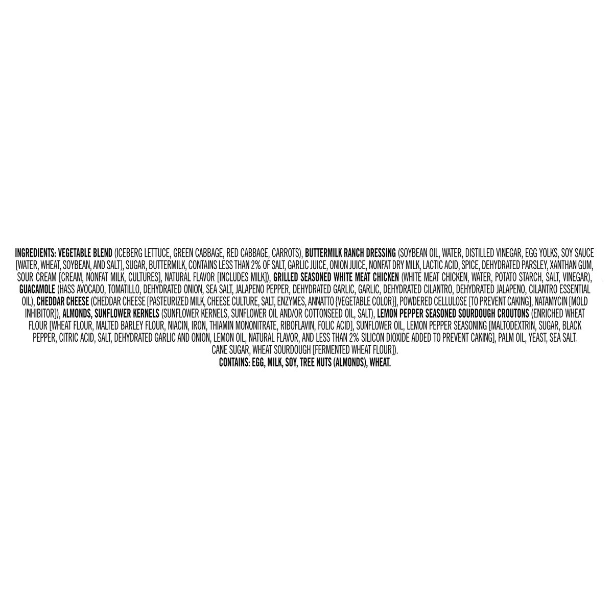 Vegetable Blend (Iceberg Lettuce, Green Cabbage, Red Cabbage, Carrots), Buttermilk Ranch Dressing (Soybean Oil, Water, Distilled Vinegar, Egg Yolks, Soy Sauce [Water, Wheat, Soybean, and Salt], Sugar,…