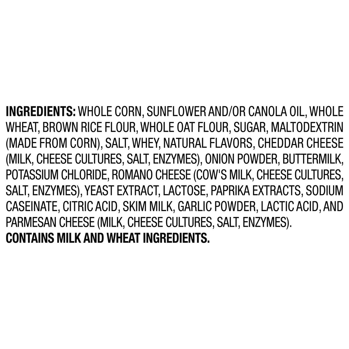 Whole Corn, Sunflower And/Or Canola Oil, Whole Wheat, Brown Rice Flour, Whole Oat Flour, Sugar, Maltodextrin (Made From Corn), Salt, Whey, Natural Flavors, Cheddar Cheese (Milk, Cheese Cultures, Salt,…