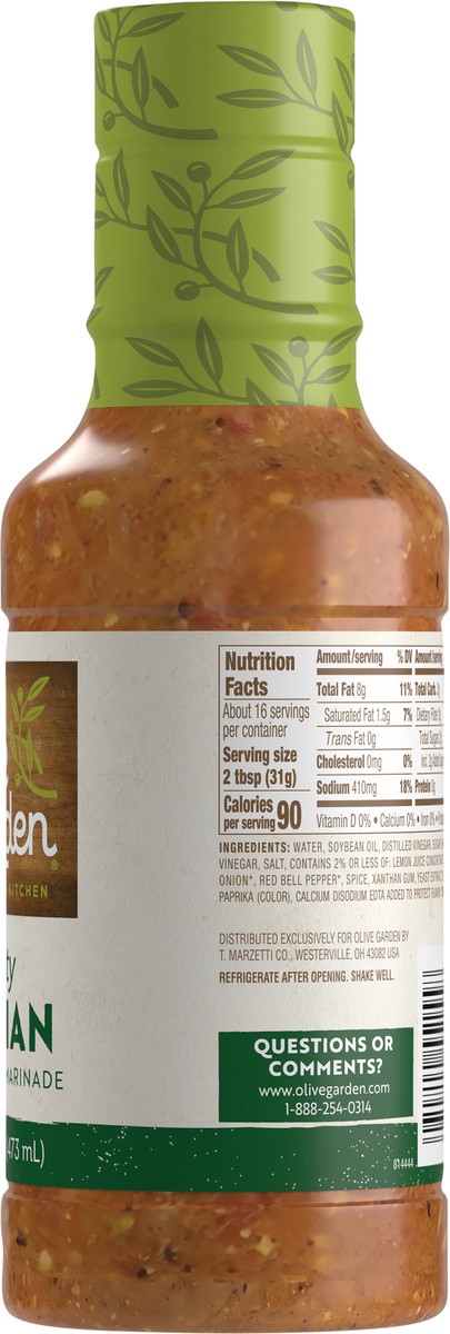 A bold blend of herbs, garlic and tangy vinegar with a peppery finish. Bring the Strength of Olive Garden to a Zesty Profile.