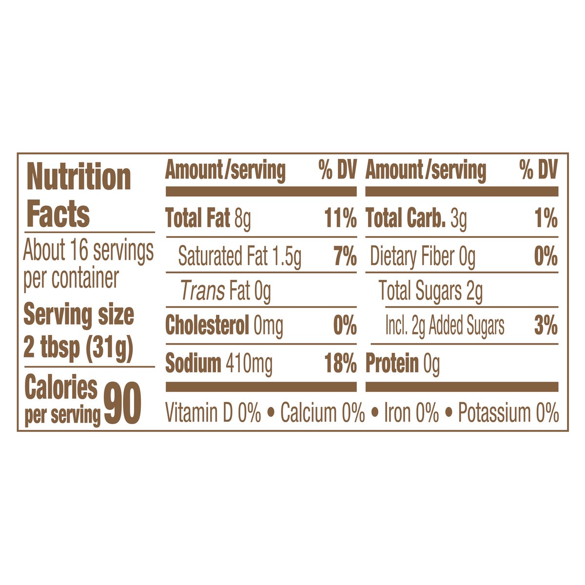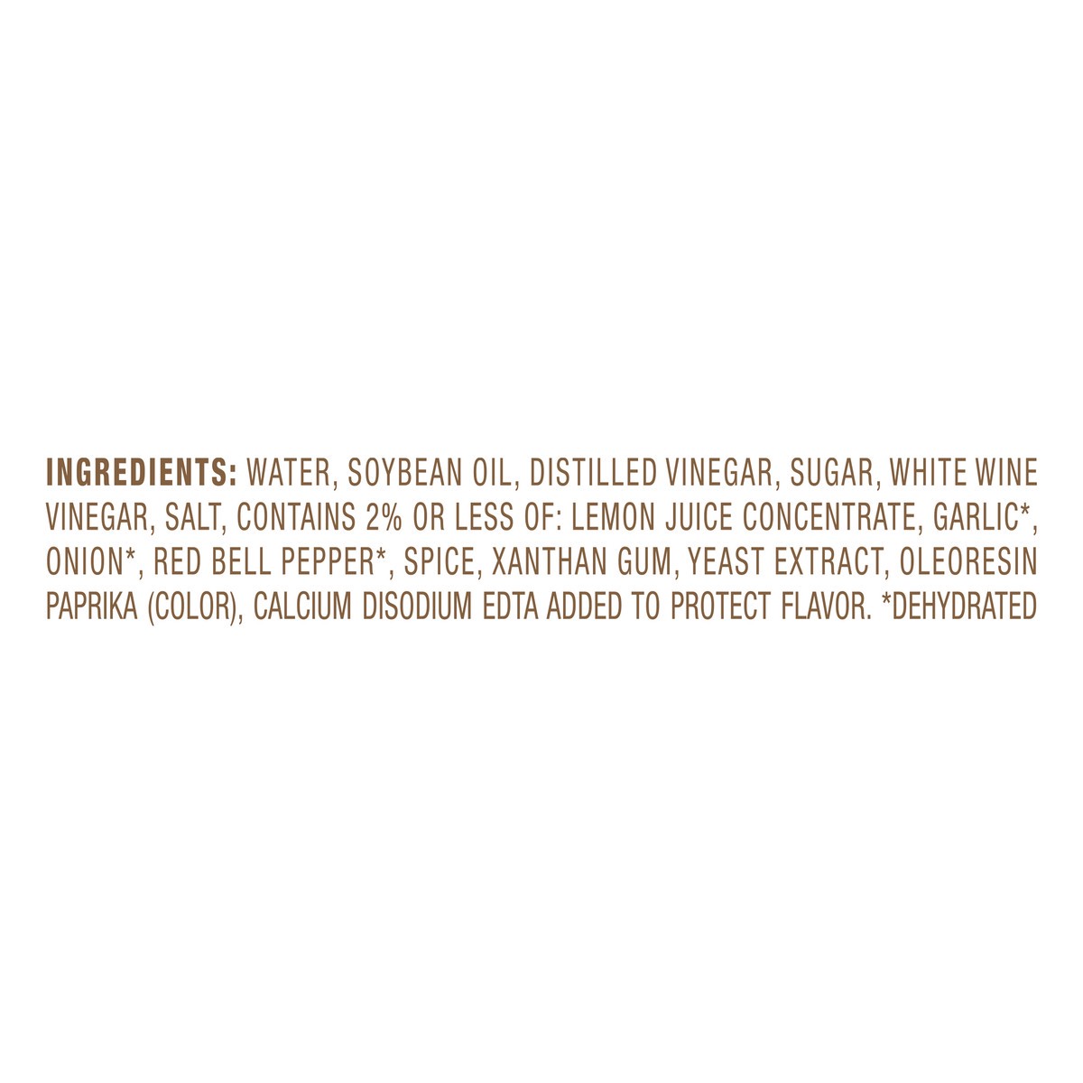 Water, Soybean Oil, Distilled Vinegar, Sugar, White Wine Vinegar, Salt, Contains 2% or Less of: Lemon Juice Concentrate, Garlic*, Onion*, Red Bell Pepper*, Spice, Xanthan Gum, Yeast Extract, Oleoresin…