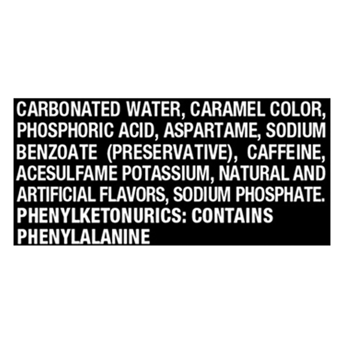 Carbonated Water, Caramel Color, Phosphoric Acid, Aspartame, Sodium Benzoate (Preservative), Caffeine, Acesulfame Potassium, Natural and Artificial Flavors, Sodium Phosphate.