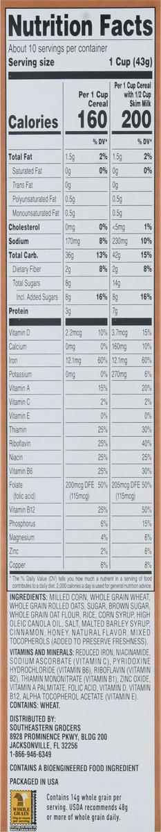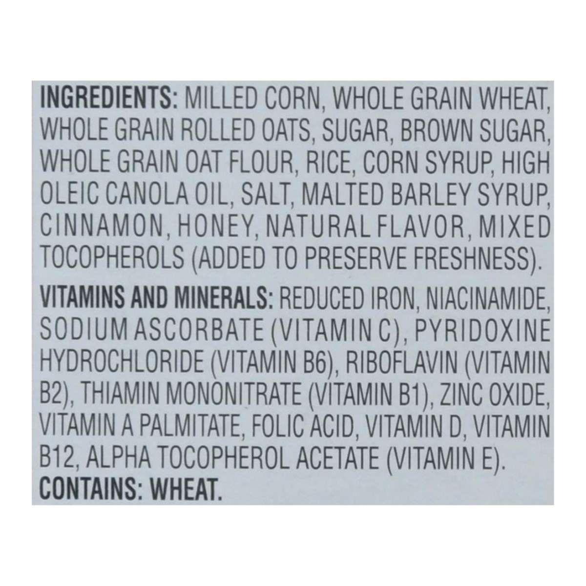 Milled Corn, Whole Grain Wheat, Whole Grain Rolled Oats, Sugar, Brown Sugar, Whole Grain Oat Flour, Rice, Corn Syrup, High Oleic Canola Oil, Salt, Malted Barley Syrup, Cinnamon, Honey, Natural Flavor,…