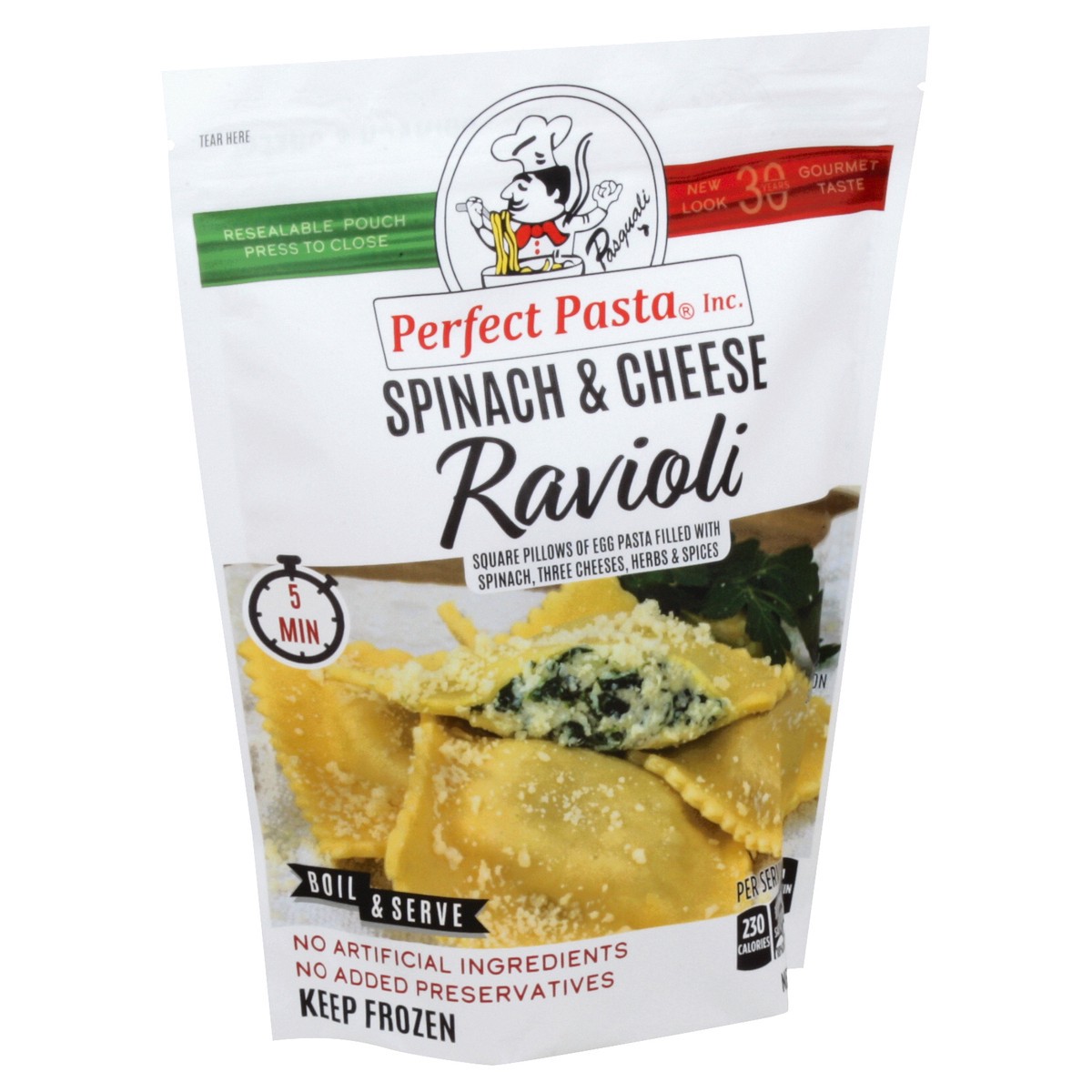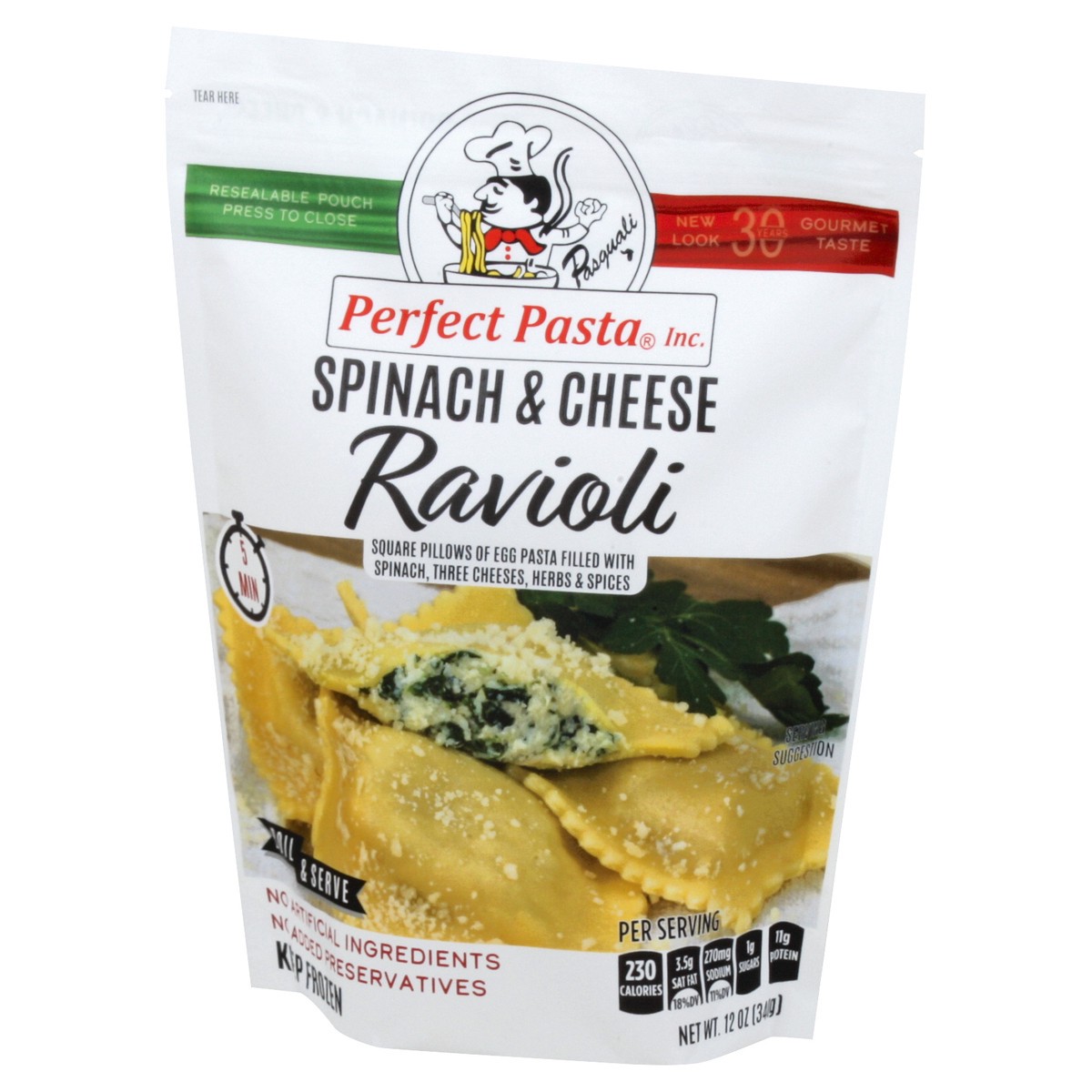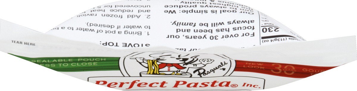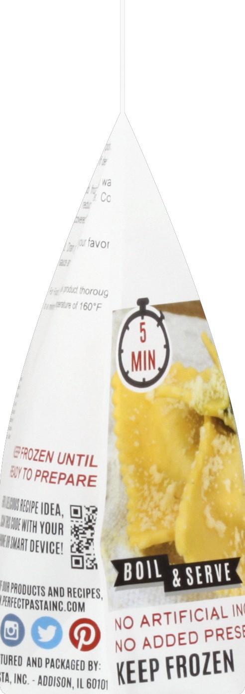 Square pillows of egg pasta filled with spinach, three cheeses, herbs & spices. Resealable pouch. New look 30 years gourmet taste. 5 min. Boil & serve. At Perfect Pasta, your table is our table! For o…