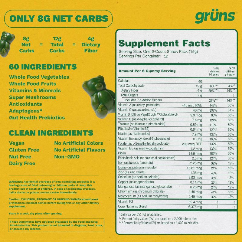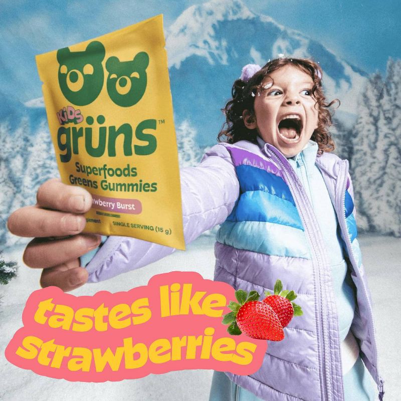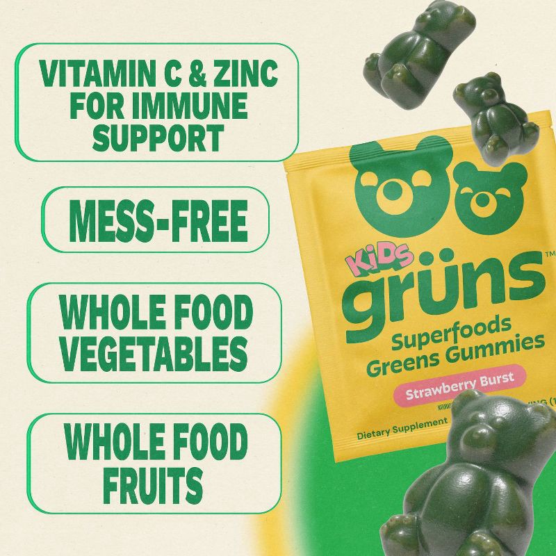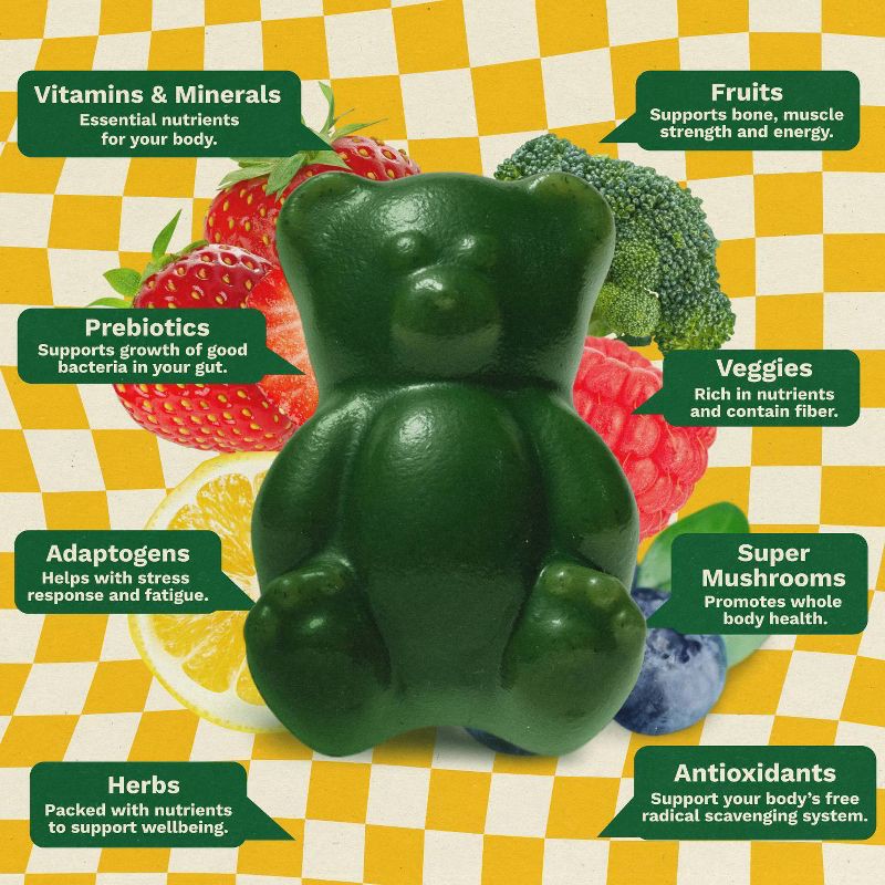 Finally, a Superfood Green Gummy that helps parents fill the gaps in their kids' diets! Grüns Super Greens Gummy Bears deliver 60 powerful ingredients, including whole fruits, veggies, super mushrooms…