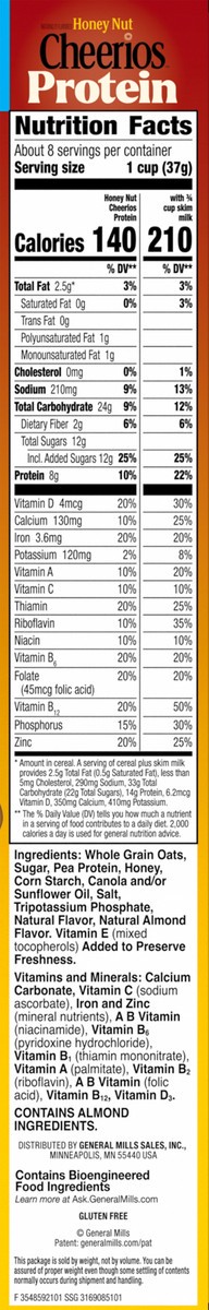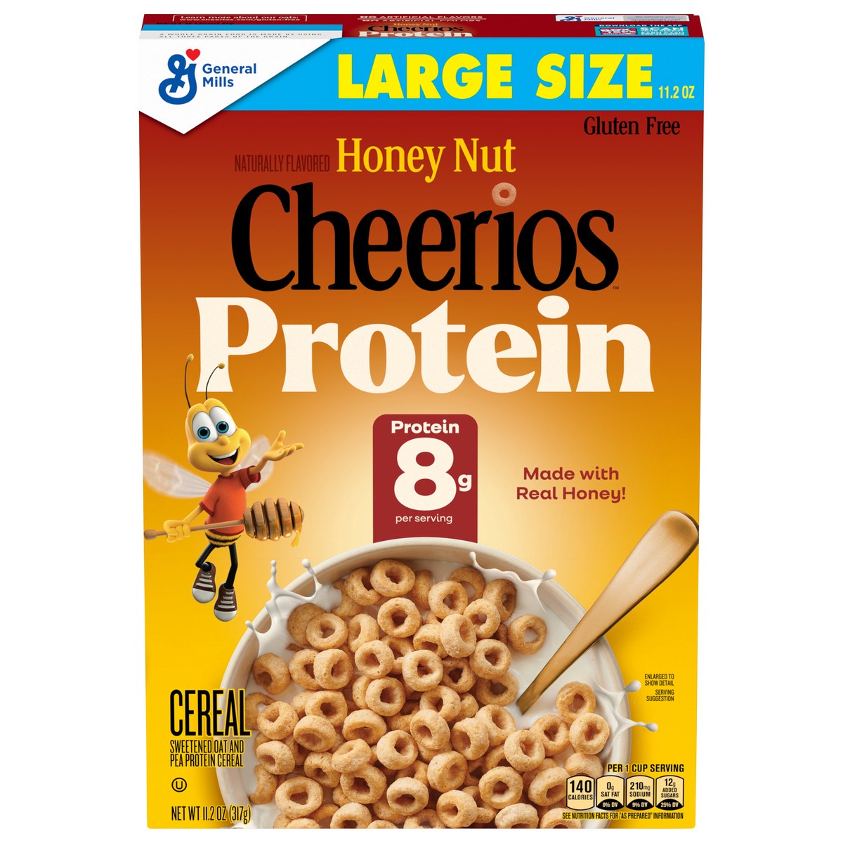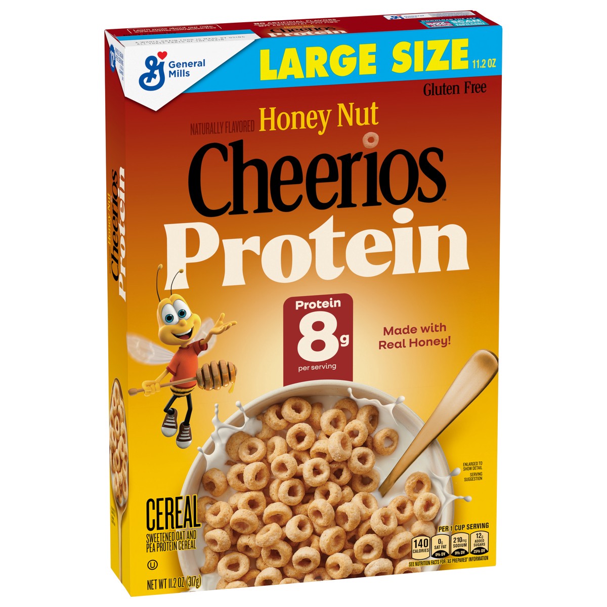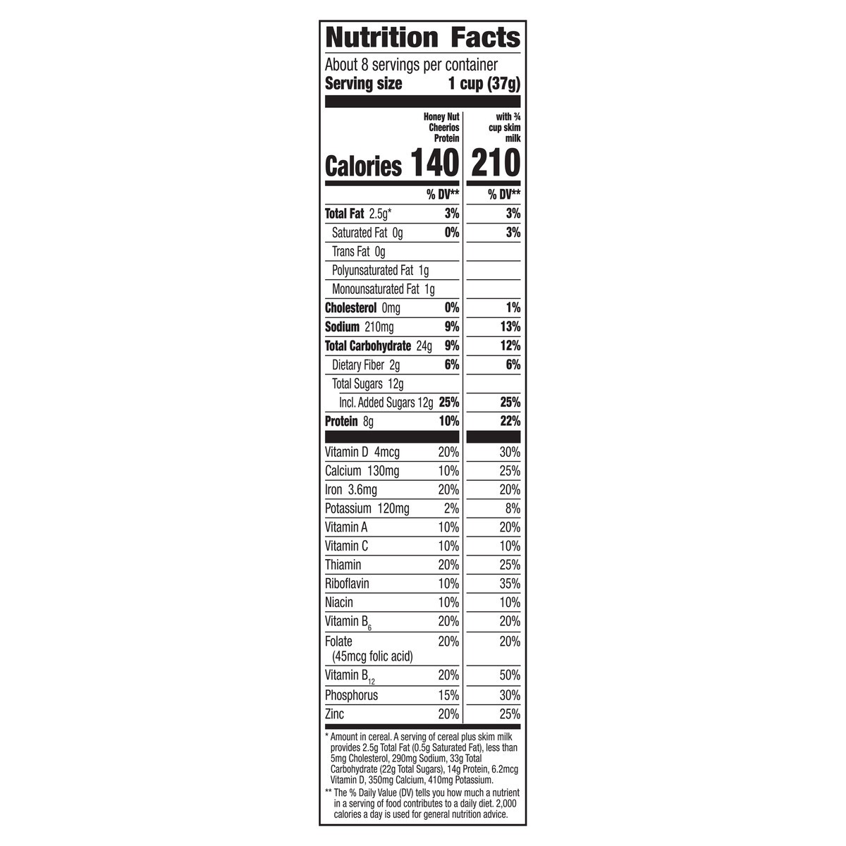 Honey Nut Cheerios™ Protein Cereal treats you and your family to the O-so-delicious taste of real honey and eight grams of protein in every serving. When you add 3/4 cup of skim milk to one cup of cer…