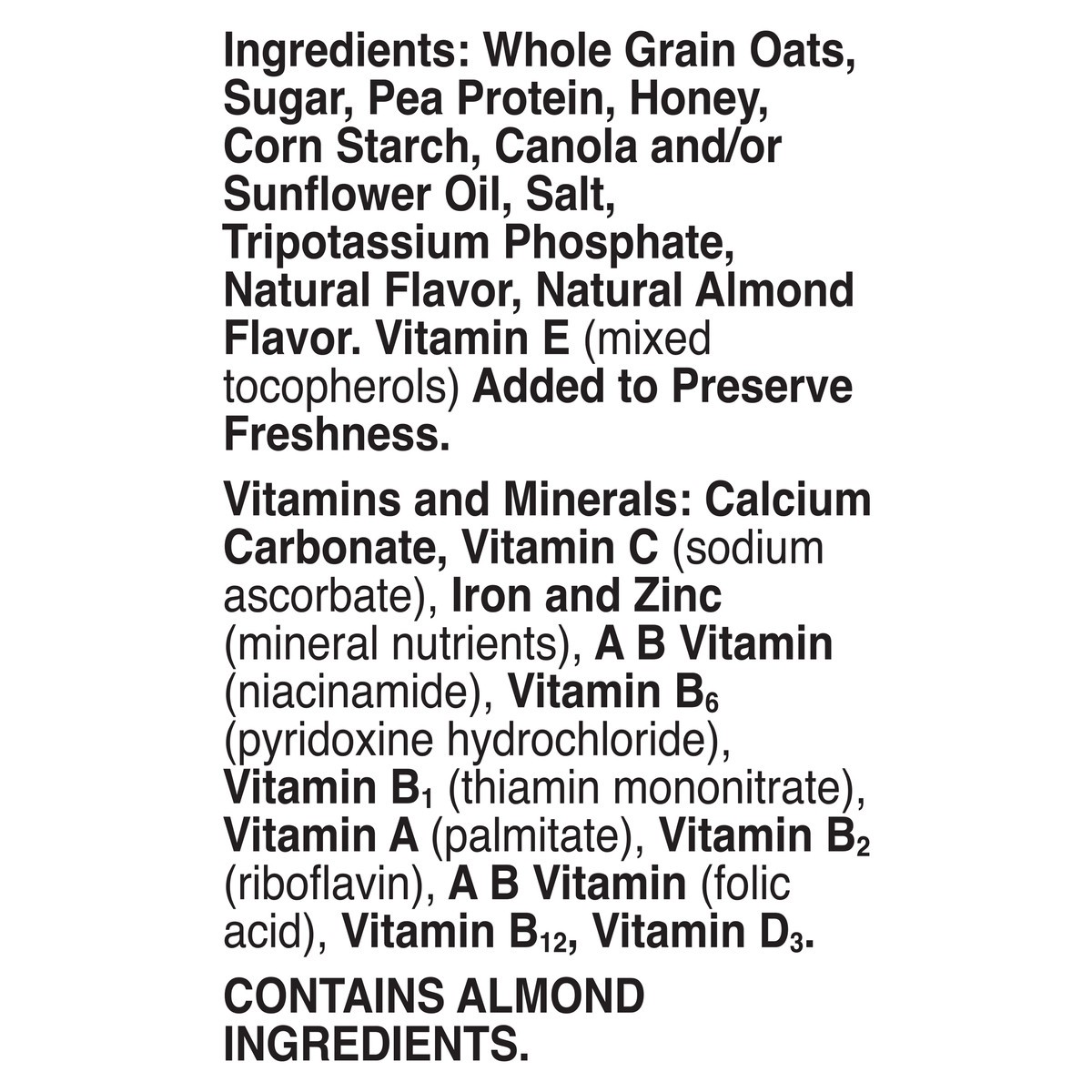 Whole Grain Oats, Sugar, Pea Protein, Honey, Corn Starch, Canola and/or Sunflower Oil, Salt, Tripotassium Phosphate, Natural Flavor, Natural Almond Flavor, Vitamin E (Mixed Tocopherols) Added to Prese…