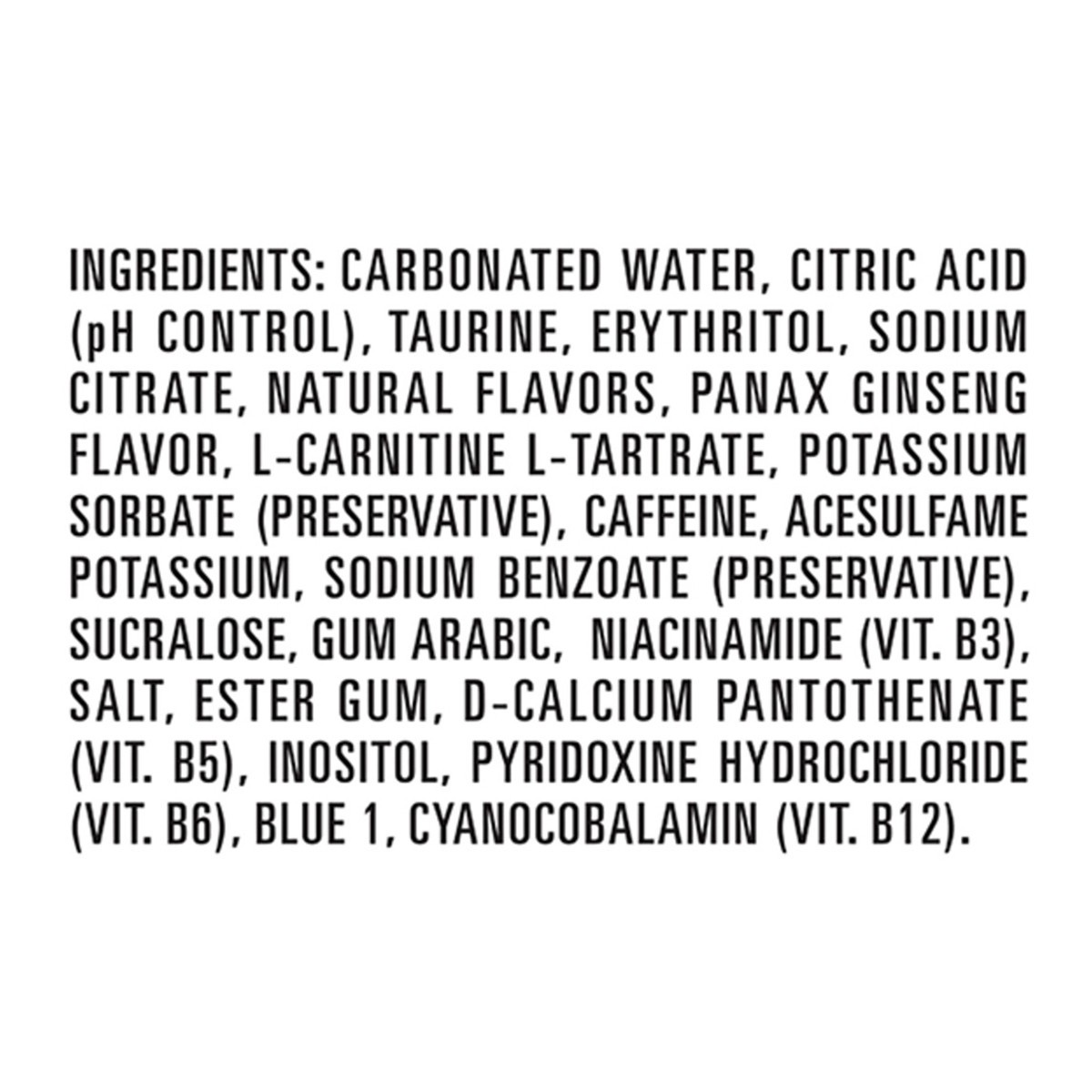Carbonated Water, Citric Acid (pH Control), Taurine, Erythritol, Sodium Citrate, Natural Flavors, Panax Ginseng Flavor, L-Carnitine L-Tartrate, Potassium Sorbate (Preservative), Caffeine, Acesulfame P…
