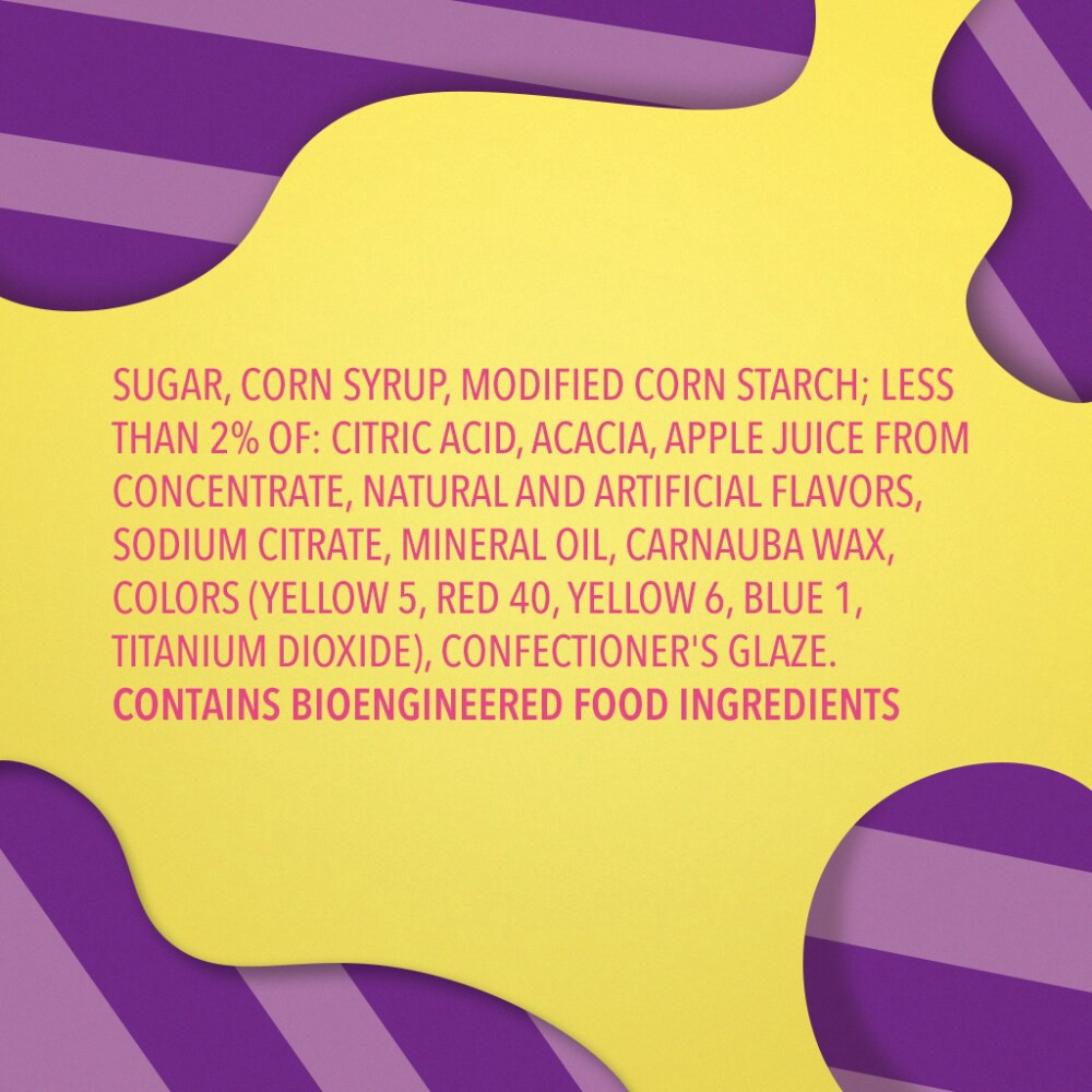 SUGAR, CORN SYRUP, MODIFIED CORN STARCH; LESS THAN 2% OF: CITRIC ACID, ACACIA, SODIUM CITRATE, APPLE JUICE FROM CONCENTRATE, NATURAL AND ARTIFICIAL FLAVORS, CONFECTIONER'S GLAZE, CARNAUBA WAX, COLORS …