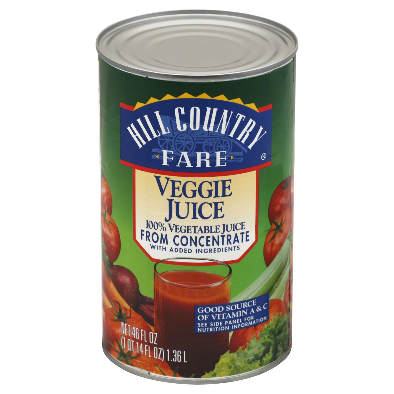100% vegetable juice from concentrate. With added ingredients. Good source of vitamin A and C. Pasteurized. Hill Country Fare hopes you are satisfied with this product.