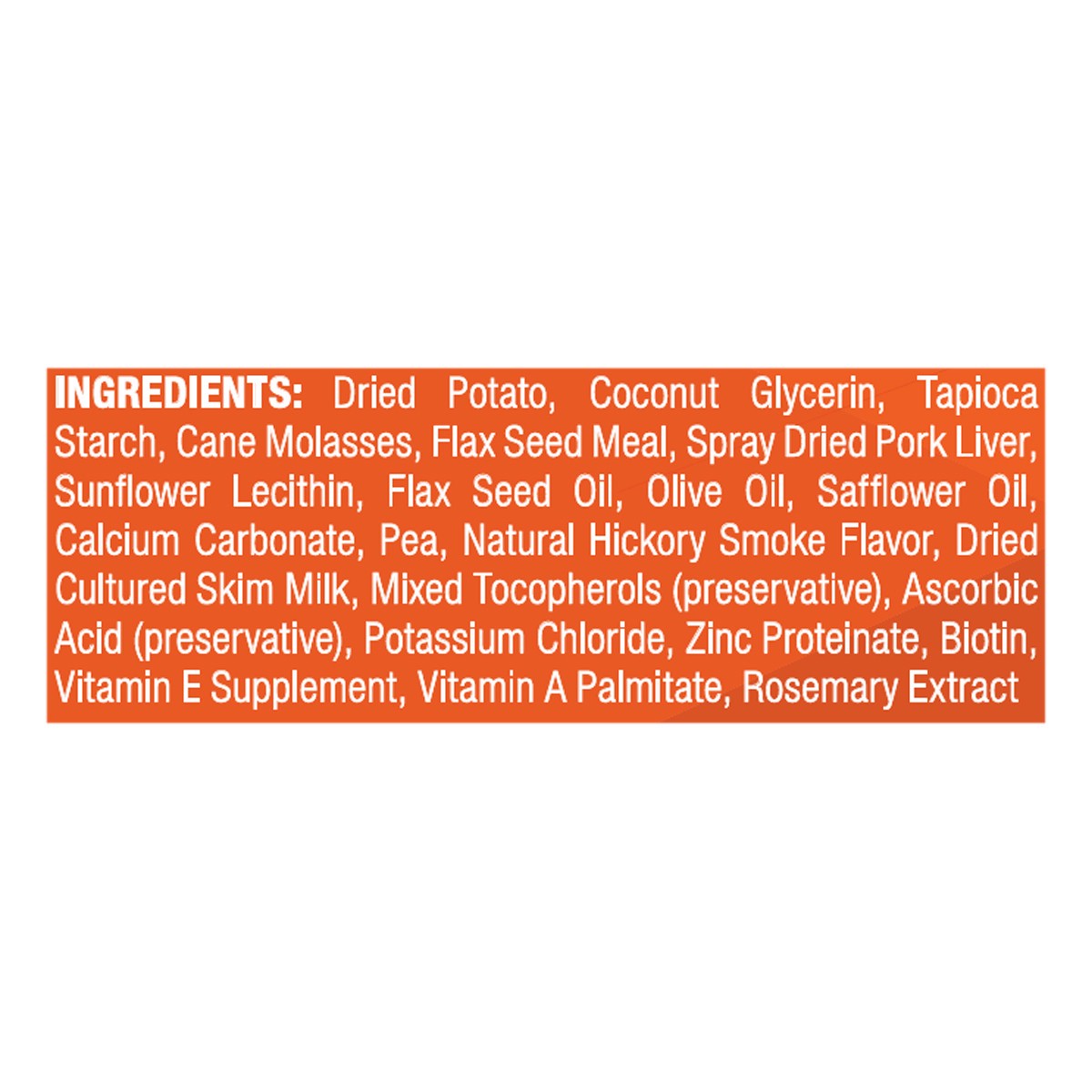 Dried Potato, Coconut Glycerin, Tapioca Starch, Cane Molasses, Flax Seed Meal, Spray Dried Pork Liver, Sunflower Lecithin, Flax Seed Oil, Olive Oil, Safflower Oil, Calcium Carbonate, Pea, Natural Hick…