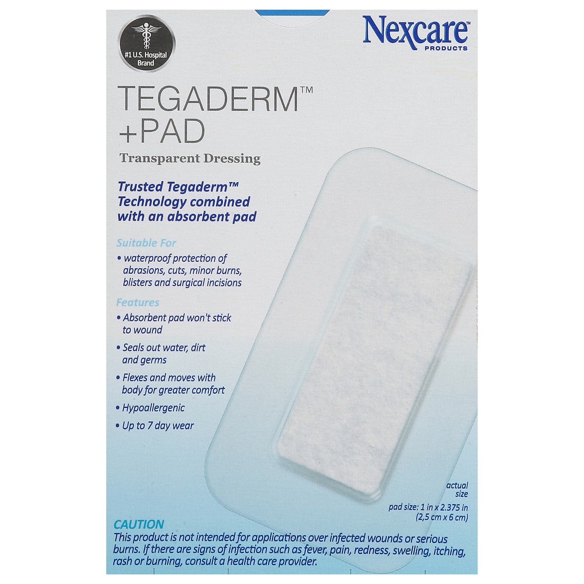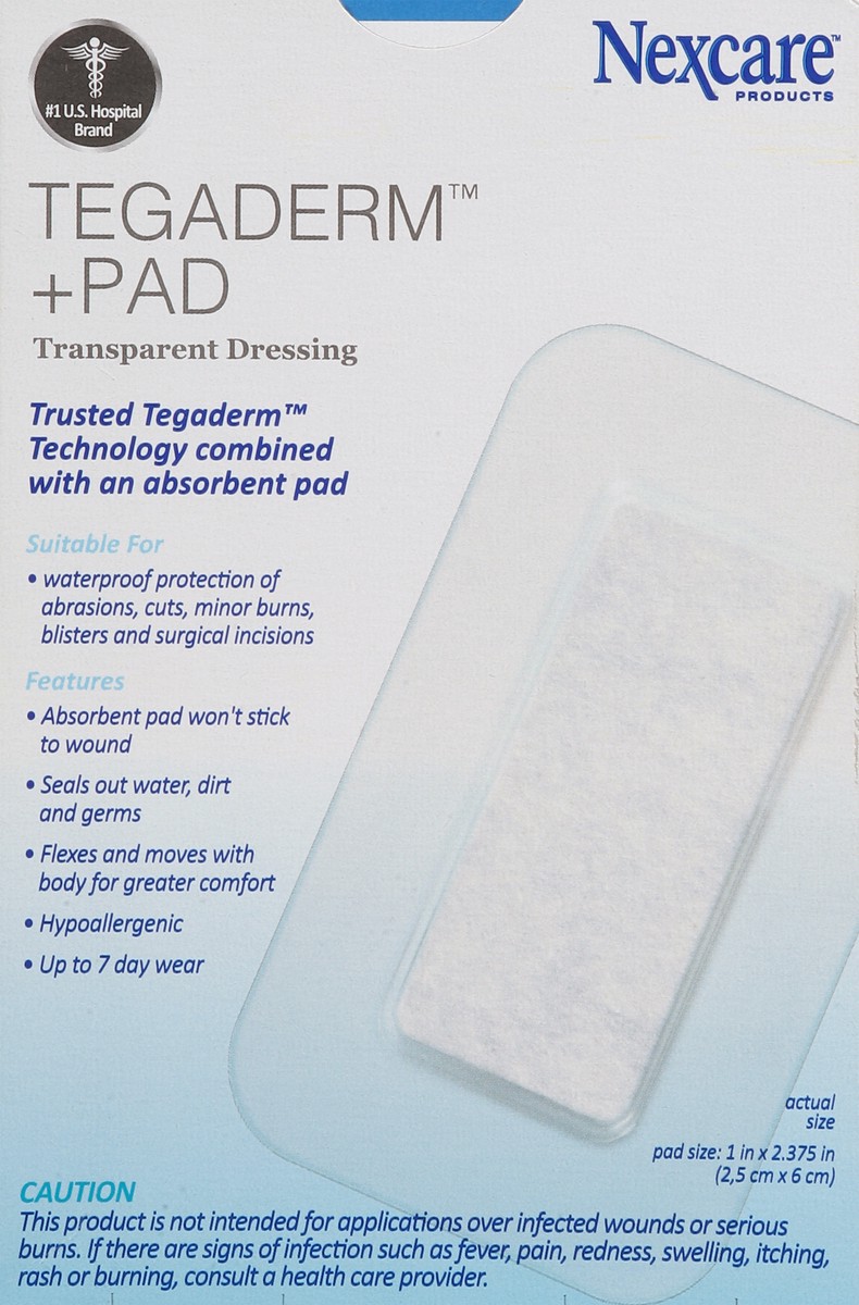 2-3/8 x 4 in (60.3 x 101 mm). Sterile adhesive pads. Tegaderm +pad. Protects & Absorbs: Seals out water, dirt and germs. Stays on in bath and shower. Pad won't stick to wound. Latex free materials. Id…