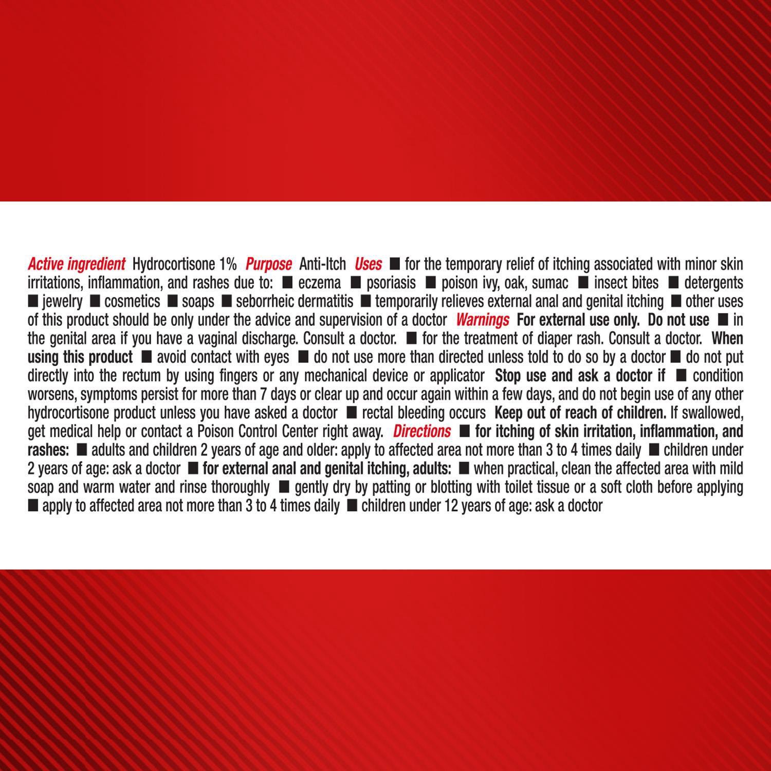 Active Ingredients: Hydrocortisone (1 %), Anti-itch. Inactive Ingredients: Water, Cetearyl Alcohol, Glycerin, Petrolatum, Mineral Oil, Isopropyl Palmitate, Sodium Lauryl Sulfate, Methylparaben, Tocoph…
