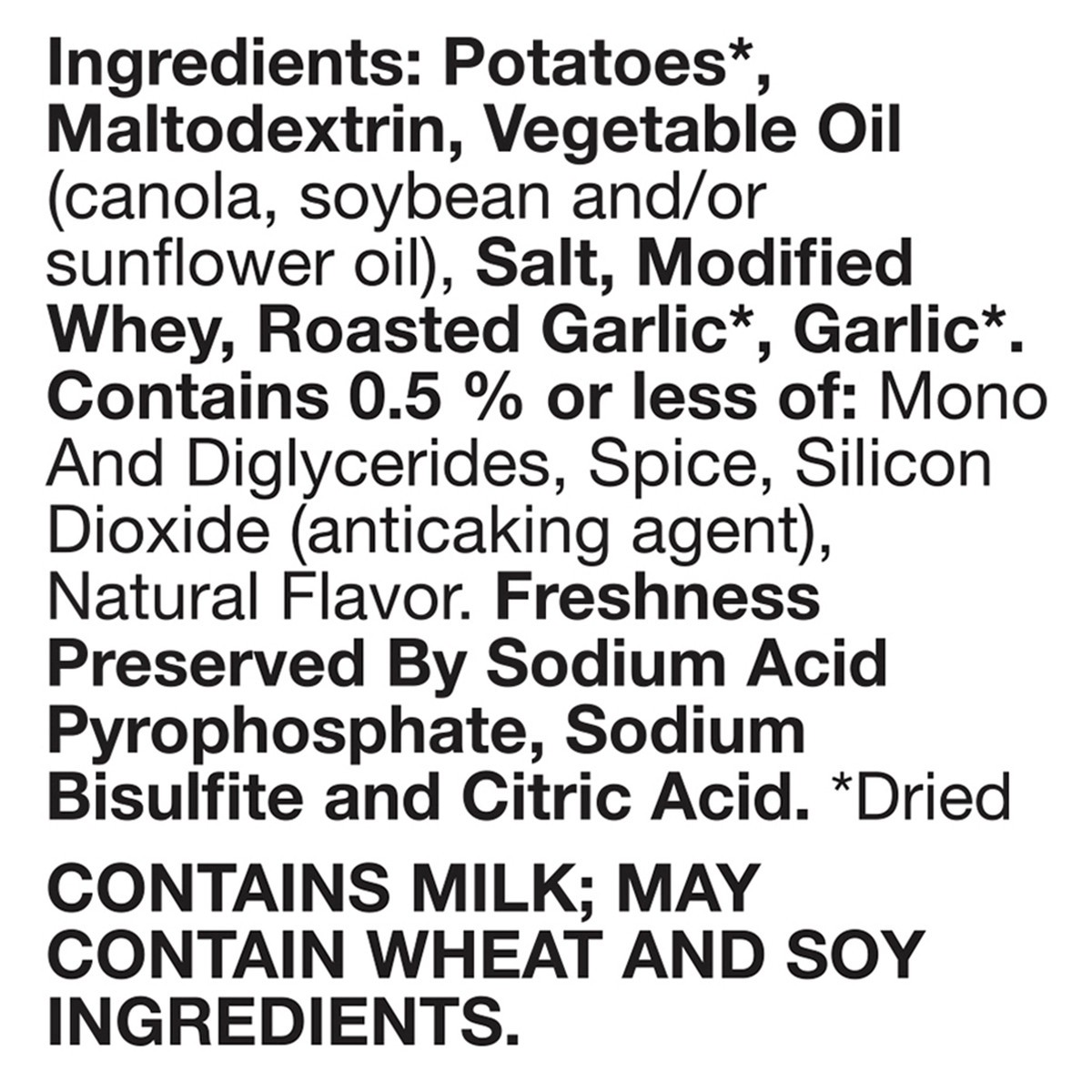 Potatoes (Dried), Maltodextrin, Vegetable Oil (Canola, Soybean and/or Sunflower Oil), Salt, Modified Whey, Roasted Garlic (Dried), Garlic (Dried), Contains 0.5% or Less of: Mono and Diglycerides, Spic…