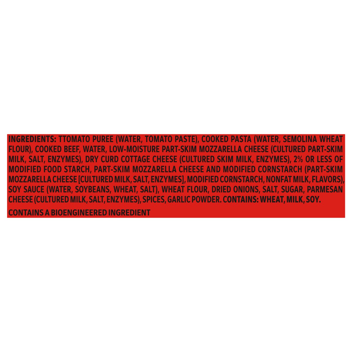 TOMATO PUREE (WATER, TOMATO PASTE), COOKED PASTA (WATER, SEMOLINA WHEAT FLOUR), COOKED BEEF, WATER, LOW-MOISTURE PART-SKIM MOZZARELLA CHEESE (CULTURED PART-SKIM MILK, SALT, ENZYMES), DRY CURD COTTAGE …