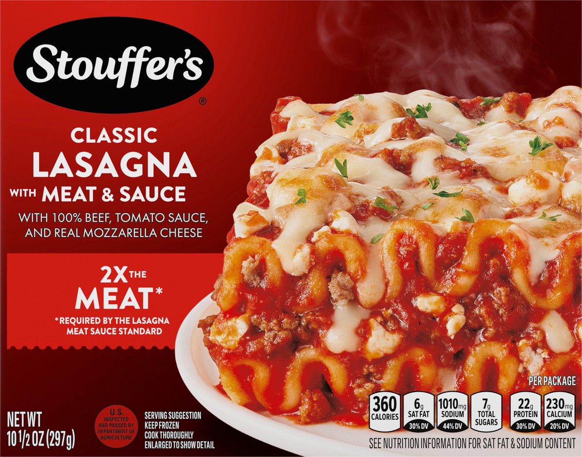 - DELICIOUS BITES FOR SOLO NIGHTS: You’ll love every bite of Stouffer’s Single Serve Lasagna with Meat & Sauce. Make any dinnertime a joyful moment with homestyle food