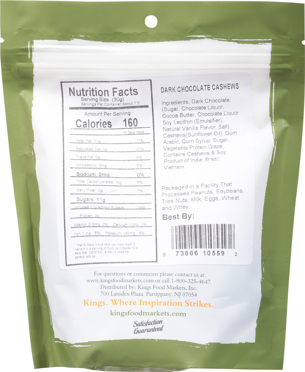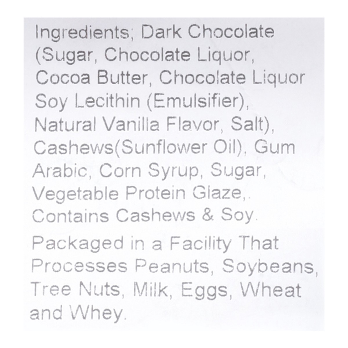 Dark Chocolate (Sugar, Chocolate Liquor, Cocoa Butter, Chocolate Liquor Soy Lecithin (Emulsifier), Natural Vanilla Flavor, Salt), Cashews (Sunflower Oil), Gum Arabic, Corn Syrup, Sugar, Vegetable Prot…