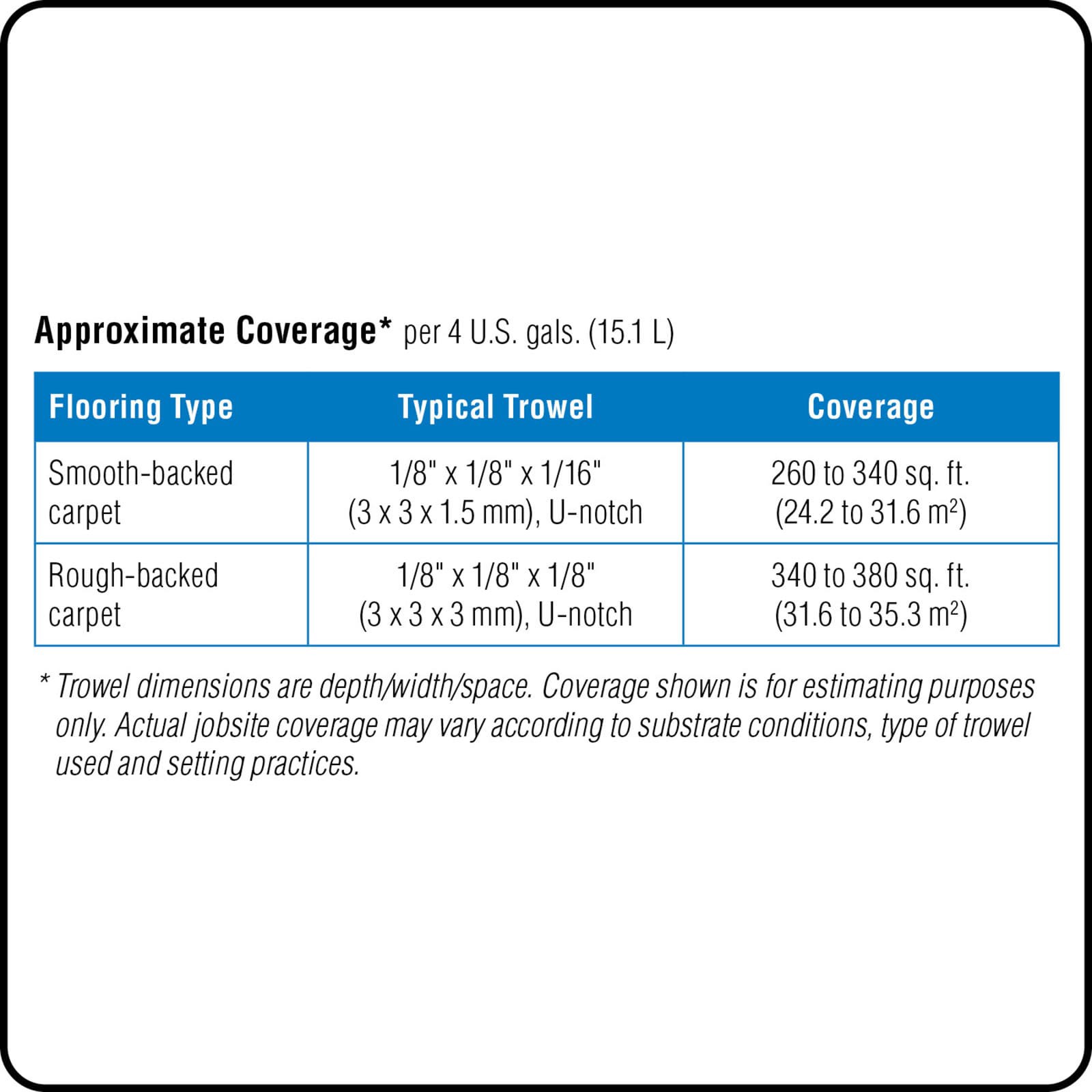 Mid-range solids level for more durable bond. Fast grab to hold carpet in place during installation. High moisture resistance. Low-odor formula for use in occupied buildings.