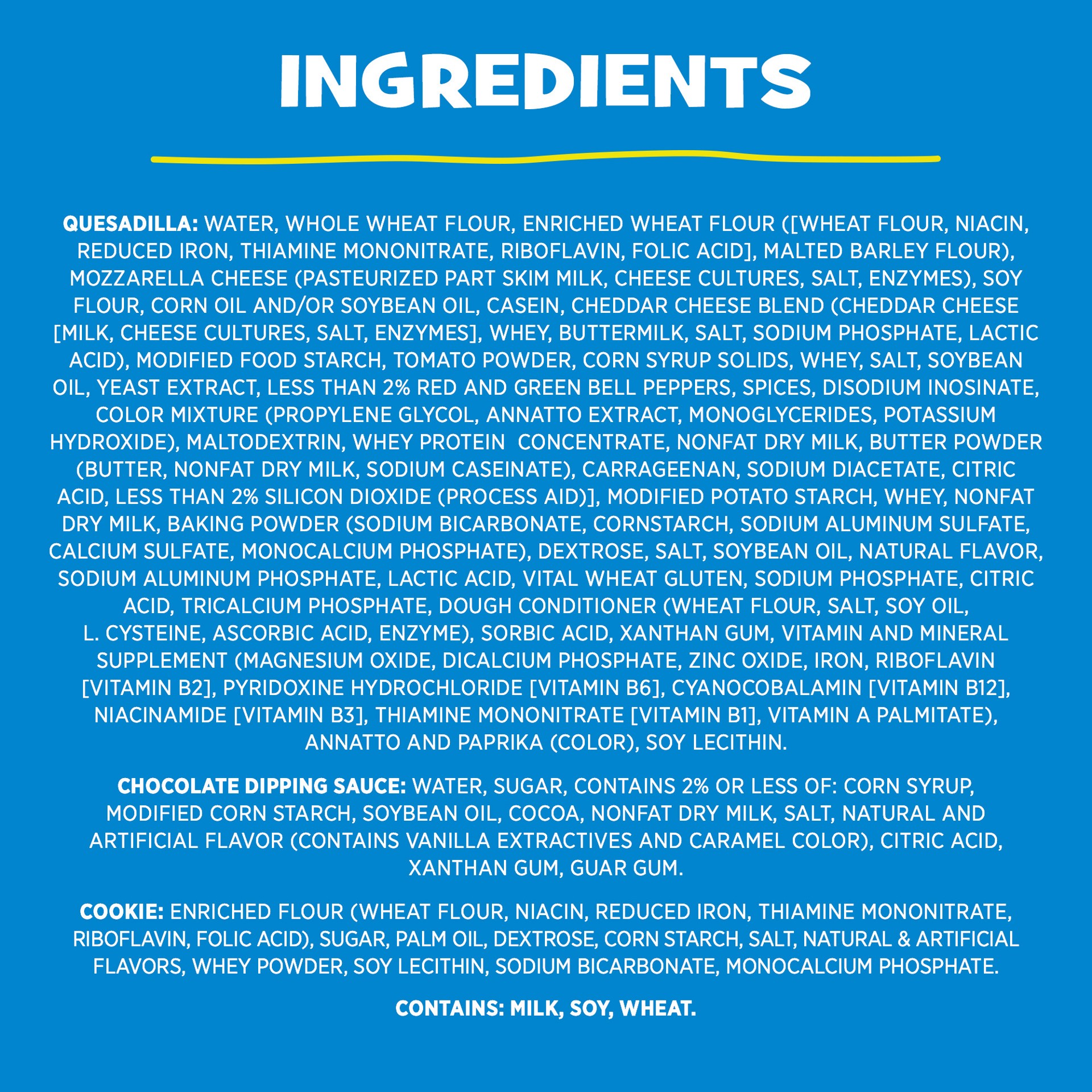Quiesadilla: Water, Whole Wheat Flour, Enriched Wheat Flour ([Wheat Flour, Niacin, Reduced Iron, Thiamine Mononitrate, Riboflavin, Folic Acid], Malted Barley Flour), Mozzarella Cheese (Pasteurized Par…