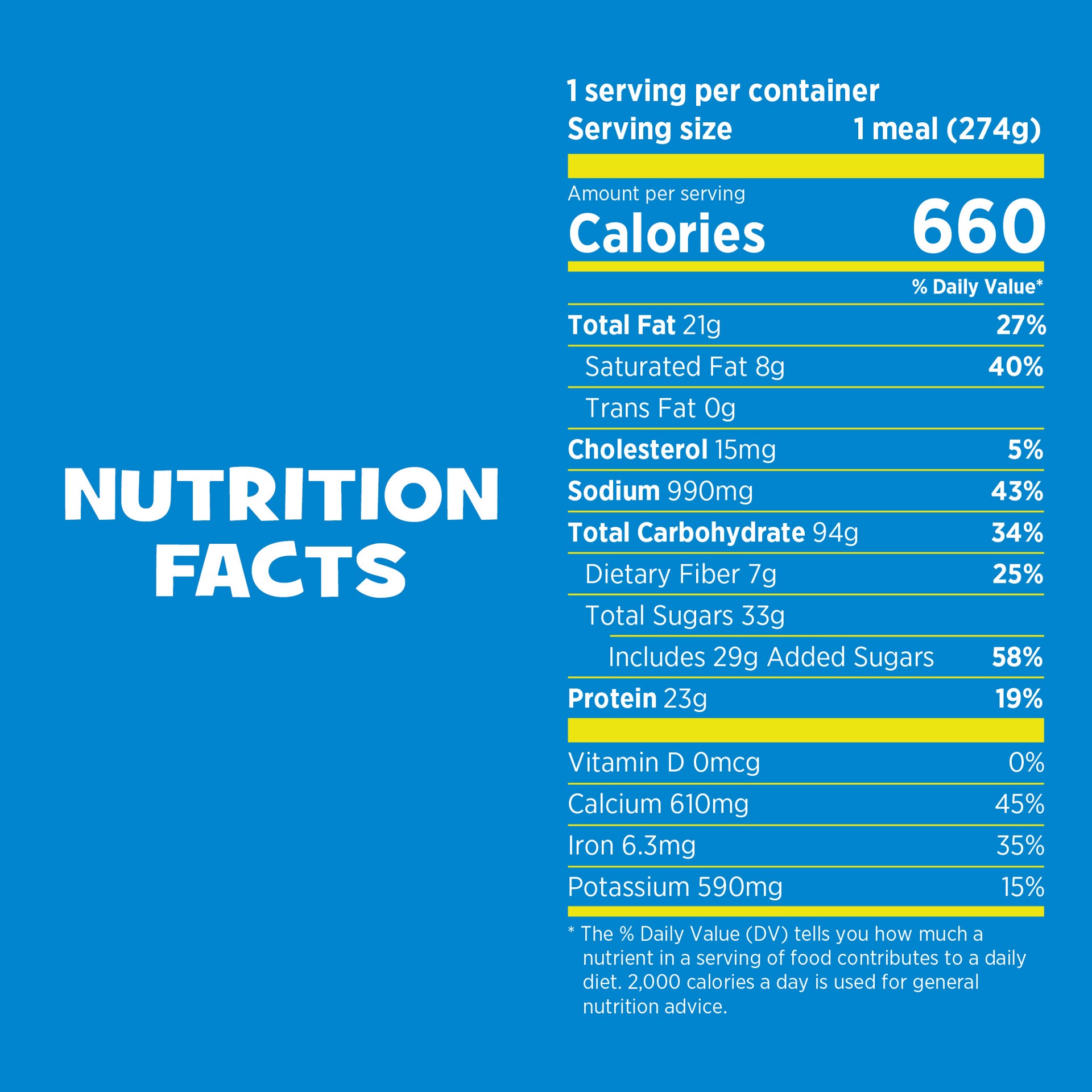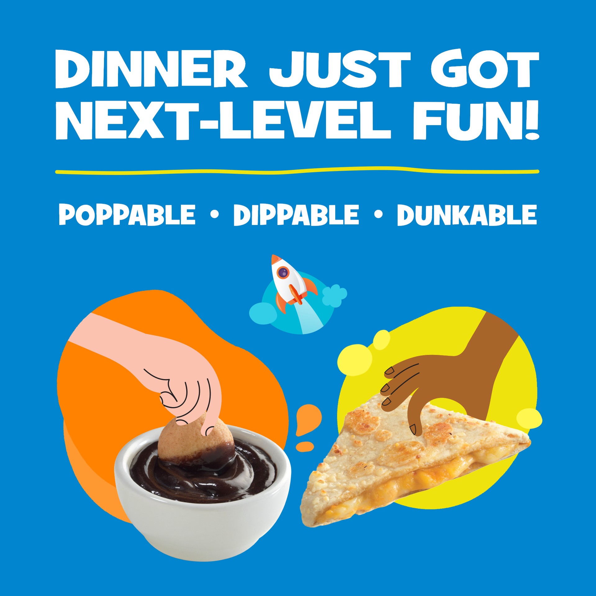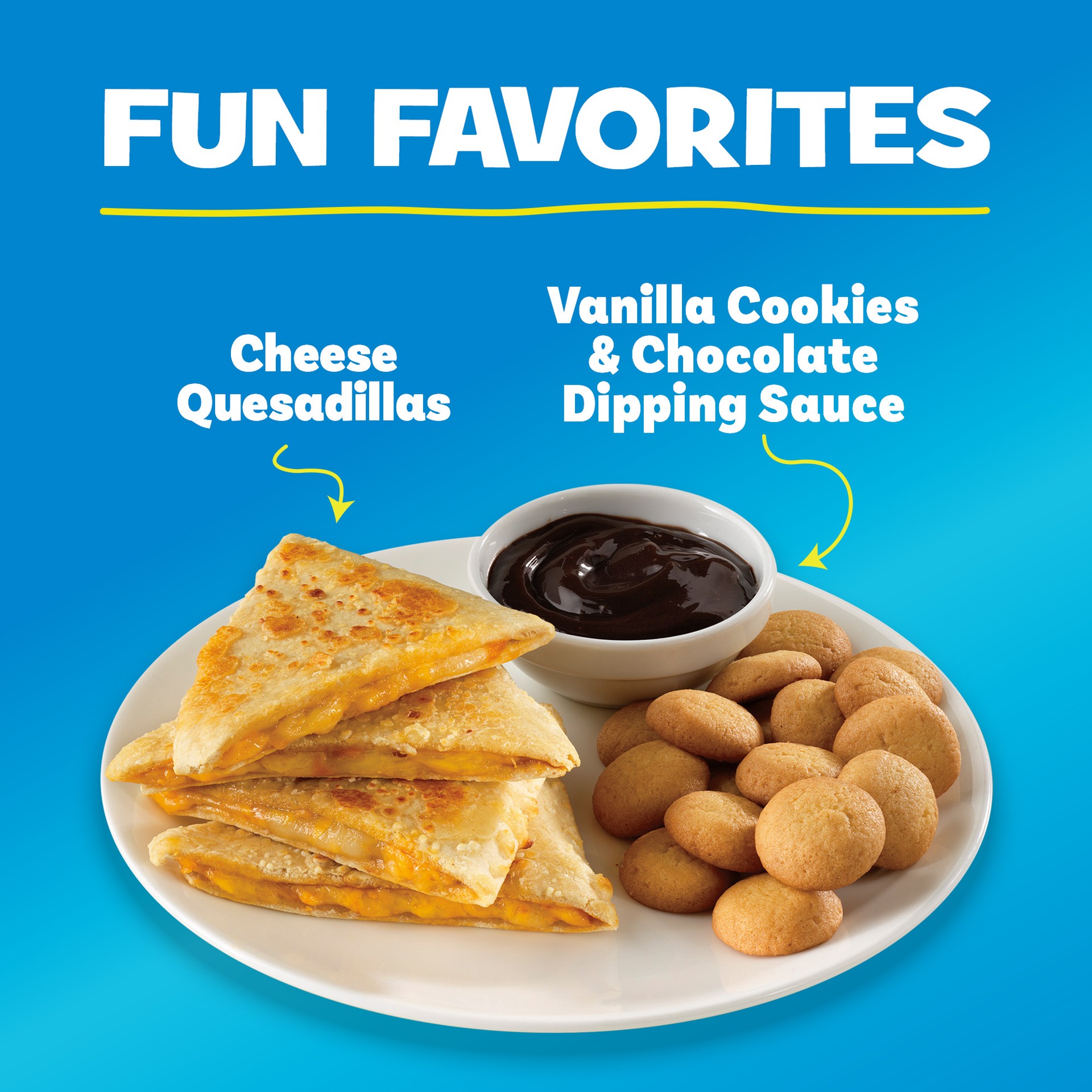 Cheese quesadillas with vanilla cookies & chocolate dipping sauce. 23 g protein. Per 1 meal: 660 calories; 8 g sat. fat (40% DV); 990 mg sodium (43% DV); 29 g added sugars (58% DV). Dinner just got ne…