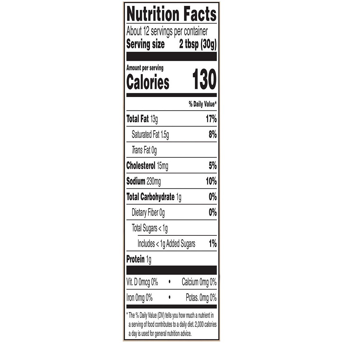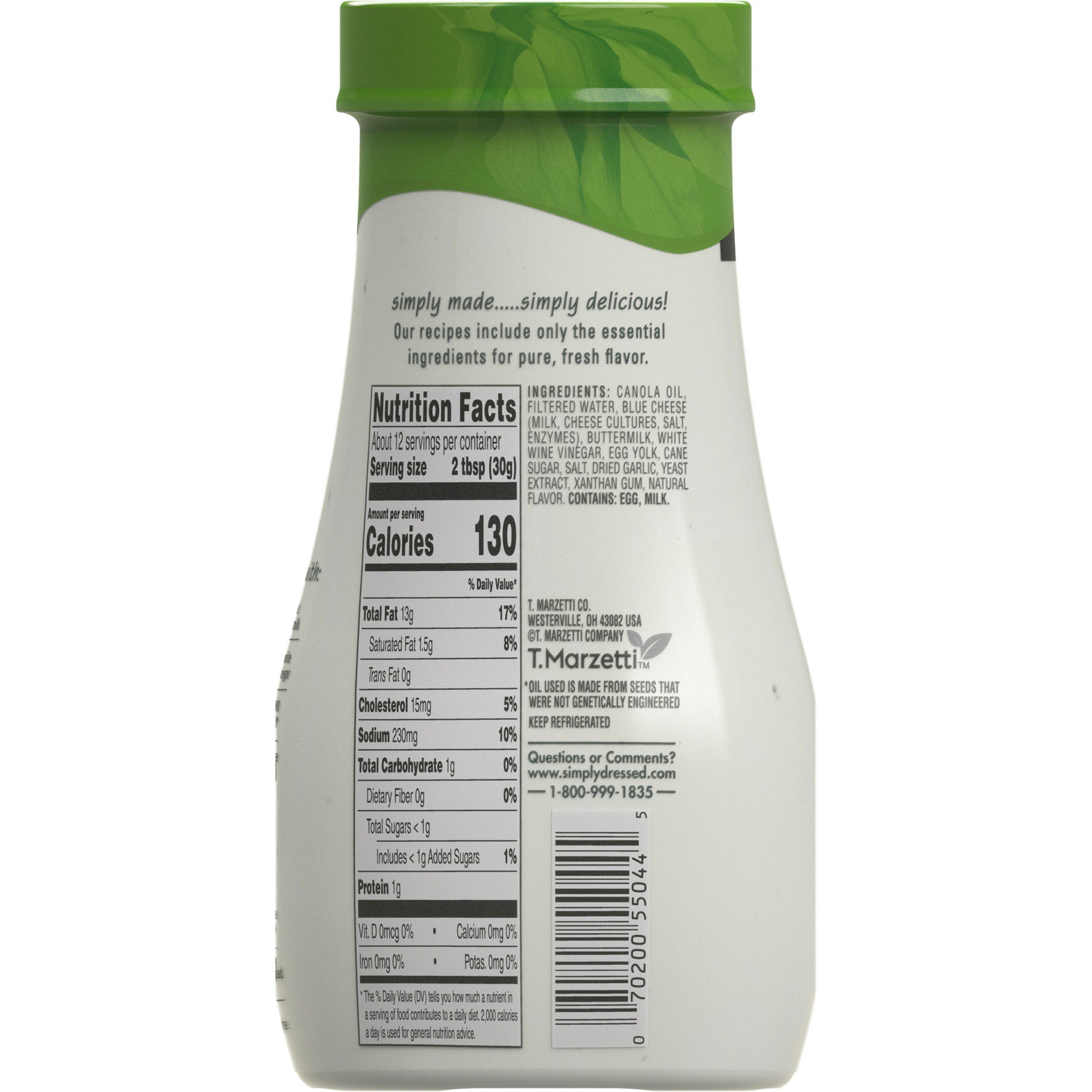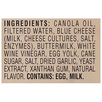 Canola Oil, Filtered Water, Blue Cheese (Milk, Cheese Cultures, Salt, Enzymes), Buttermilk, White Wine Vinegar, Egg Yolk, Cane Sugar, Salt, Dried Garlic, Yeast Extract, Xanthan Gum, Natural Flavor.