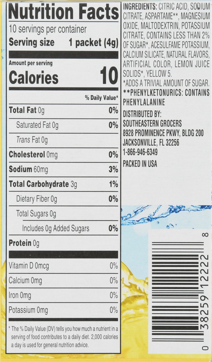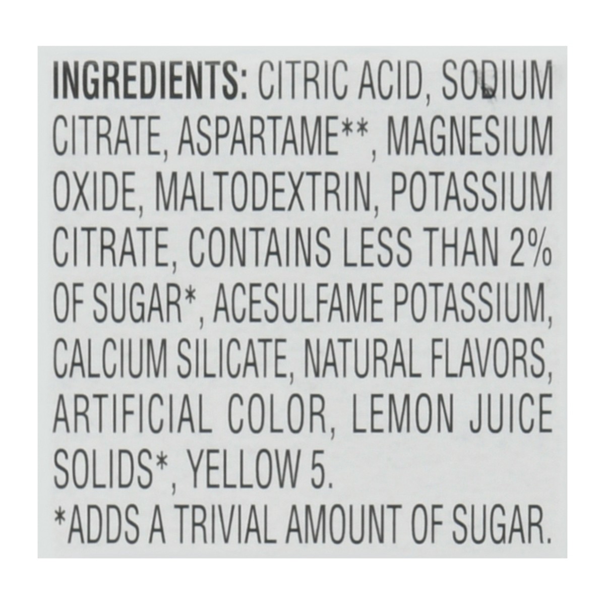 Citric Acid, Sodium Citrate, Aspartame (Phenylketonurics: Contains Phenylalanine), Magnesium Oxide, Maltodextrin, Potassium Citrate, Contains Less than 2% of Sugar (Adds a Trivial Amount of Sugar), Ac…