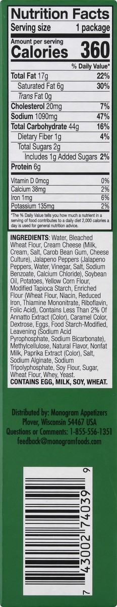 Water, Bleached Wheat Flour, Cream Cheese (Milk, Cream, Contains Less than 2% of Salt, Carob Bean Gum, Cheese Culture), Jalapeno Pepper, Soybean Oil, Food Starch-Modified, Potato, Yellow Corn Flour, E…