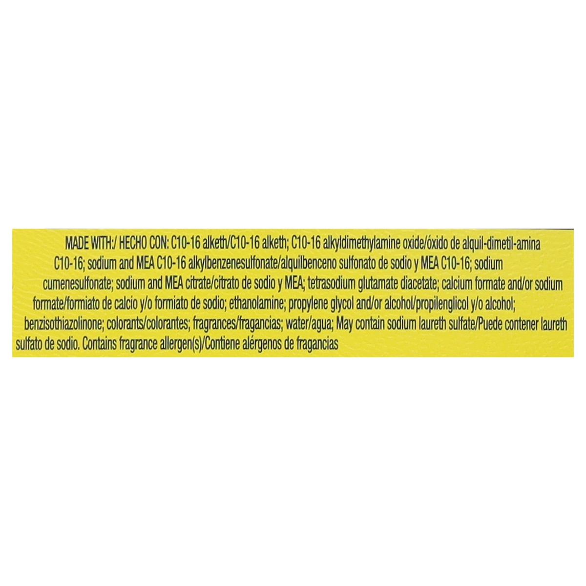 C10-16 pareth; sodium and MEA C10-16 alkylbenzenesulfonate/alquilbenceno sulfonato de sodio y MEA C10-16; C10-16 alkyldimethylamine oxide/óxido de alquil-dimetil-amina C10-16; sodium cumenesulfonate; …