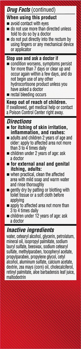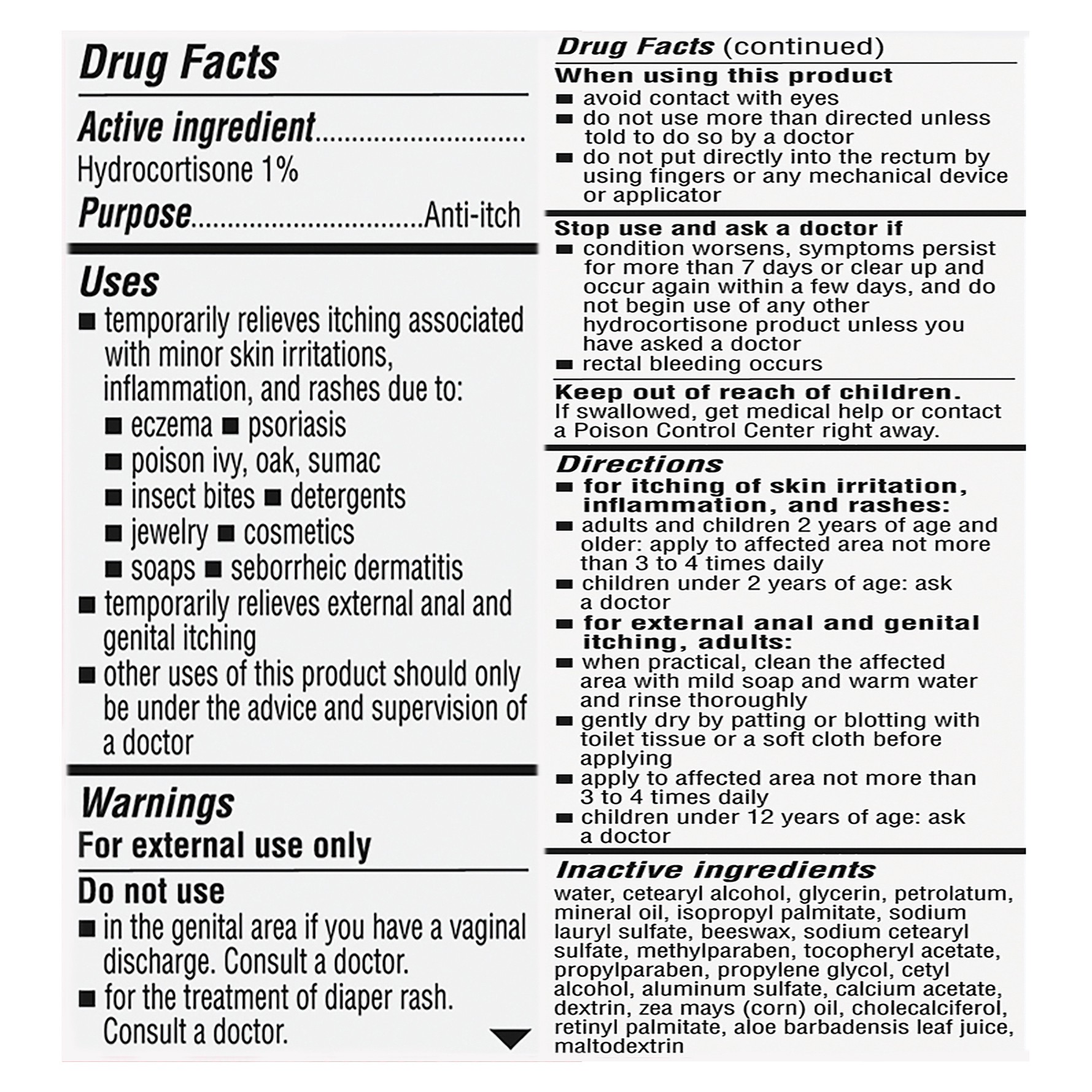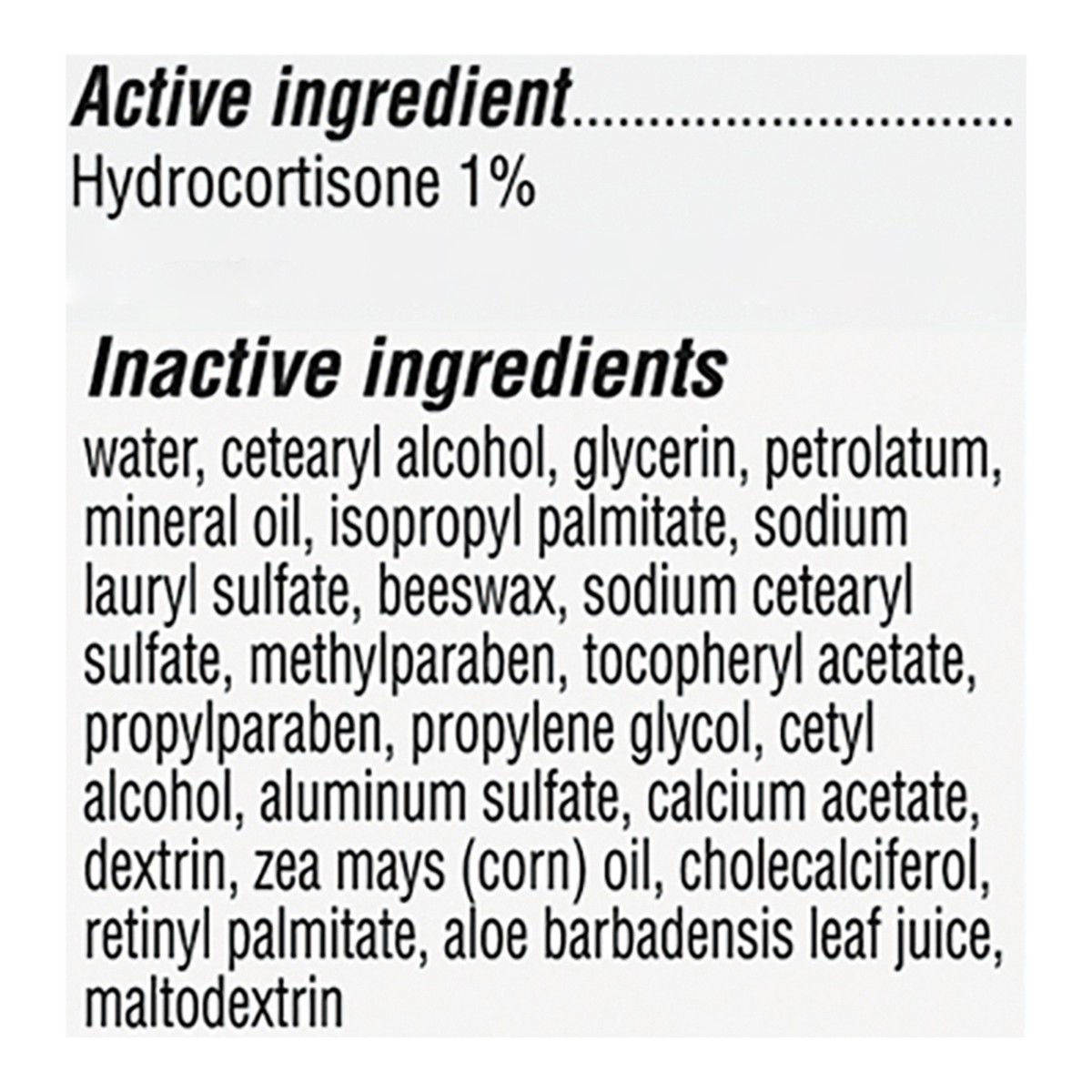 Active Ingredients: Hydrocortisone (1 %), Anti-itch. Inactive Ingredients: Water, Cetearyl Alcohol, Glycerin, Petrolatum, Mineral Oil, Isopropyl Palmitate, Sodium Lauryl Sulfate, Bees Wax, Sodium Cete…