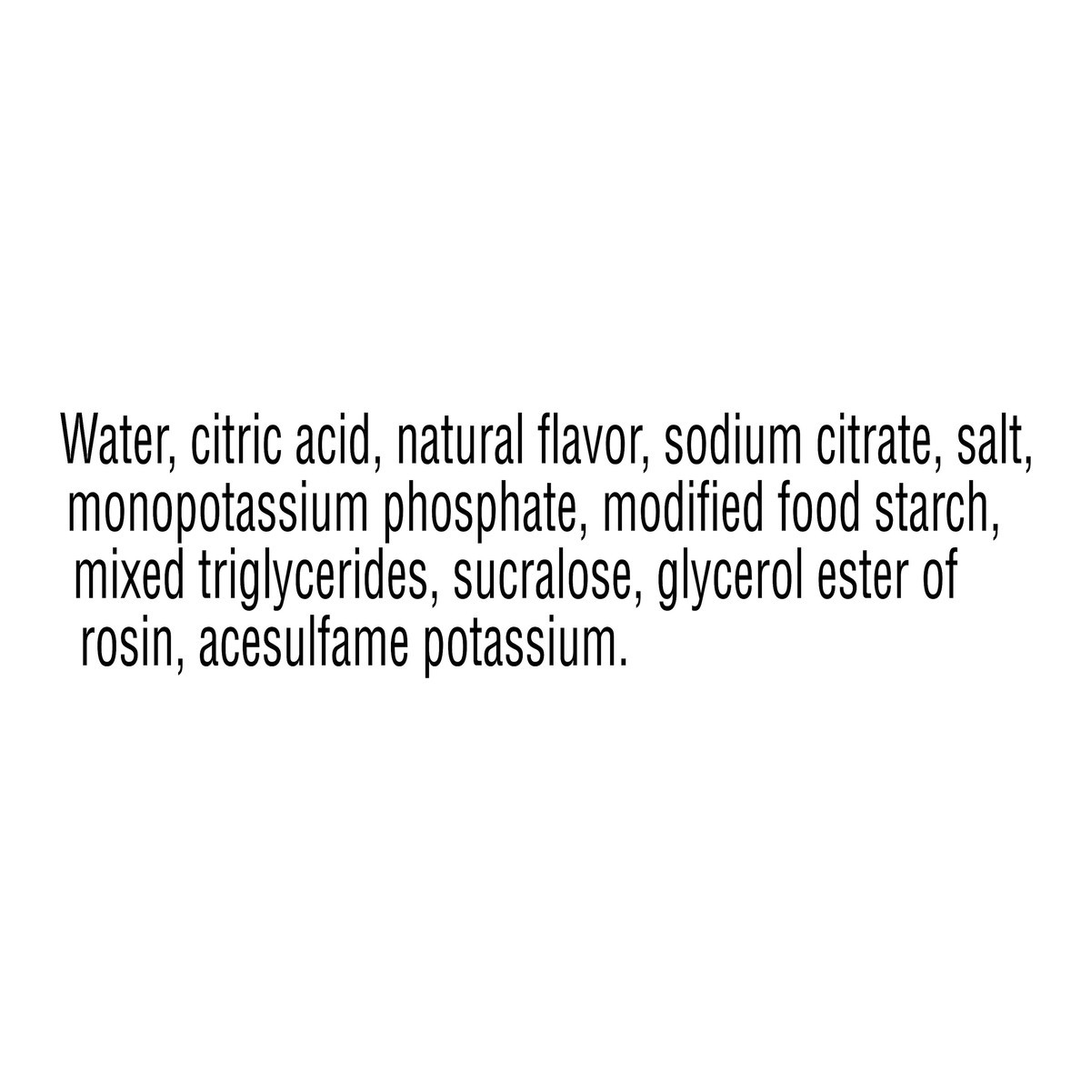 WATER, CITRIC ACID, NATURAL FLAVOR, SODIUM CITRATE, SALT, MONOPOTASSIUM PHOSPHATE, MODIFIED FOOD STARCH, MIXED TRIGLYCERIDES, SUCRALOSE, GLYCEROL ESTER OF ROSIN, ACESULFAME POTASSIUM.