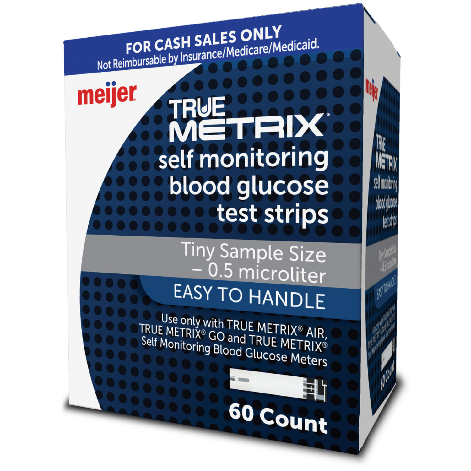 Meijer TRUE METRIX test strips 60ct offers a low cost solution for cash paying patients. For use with the Meijer TRUE METRIX GO, Meijer TRUE METRIX and Meijer TRUE METRIX AIR Self monitoring Blood Glu…